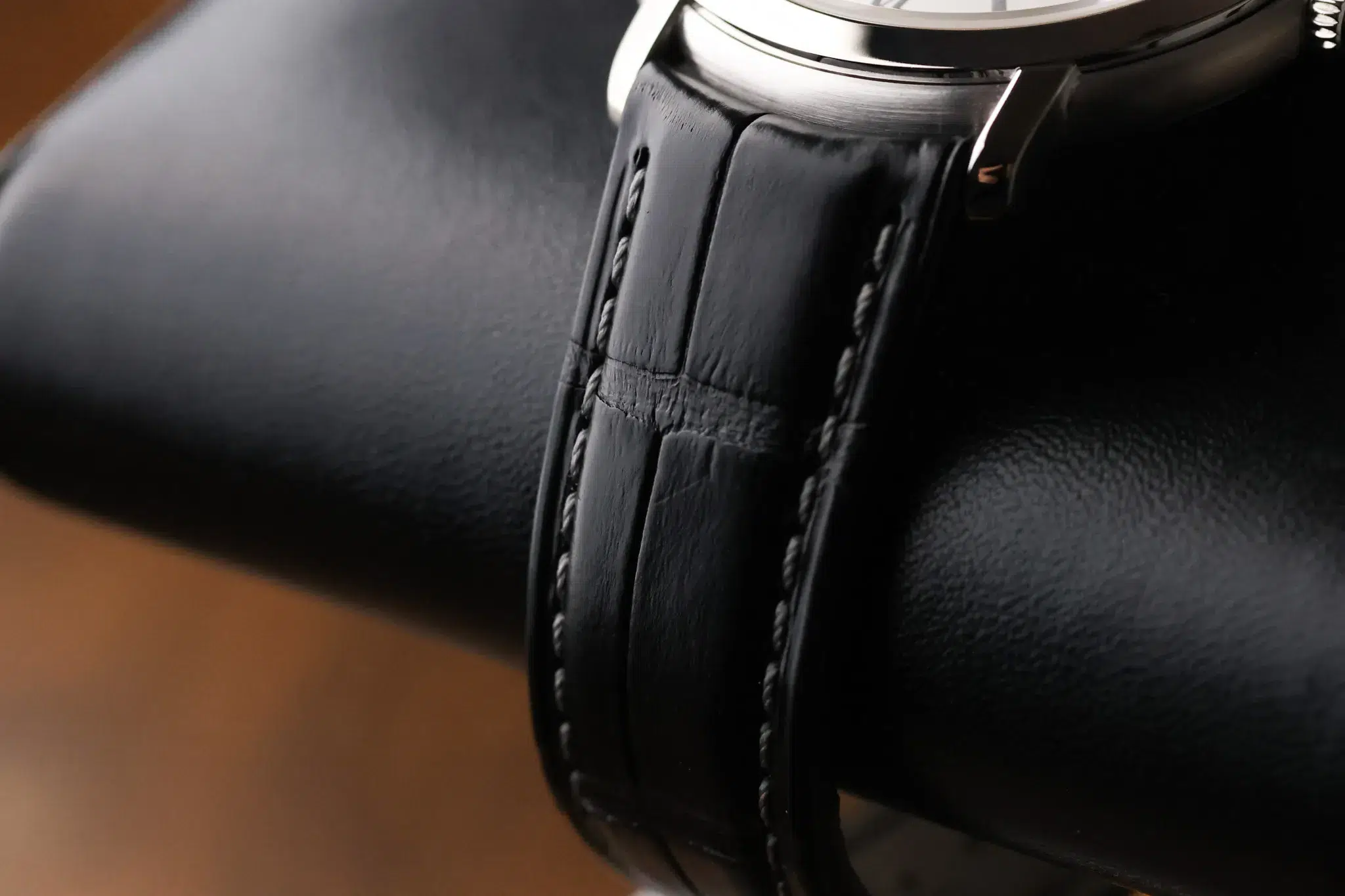 This Jules comes on a black leather strap. The leather is soft, comfortable, and light on the wrist. If you ever want to change the look, this reference works well with dark brown leather or alligator.