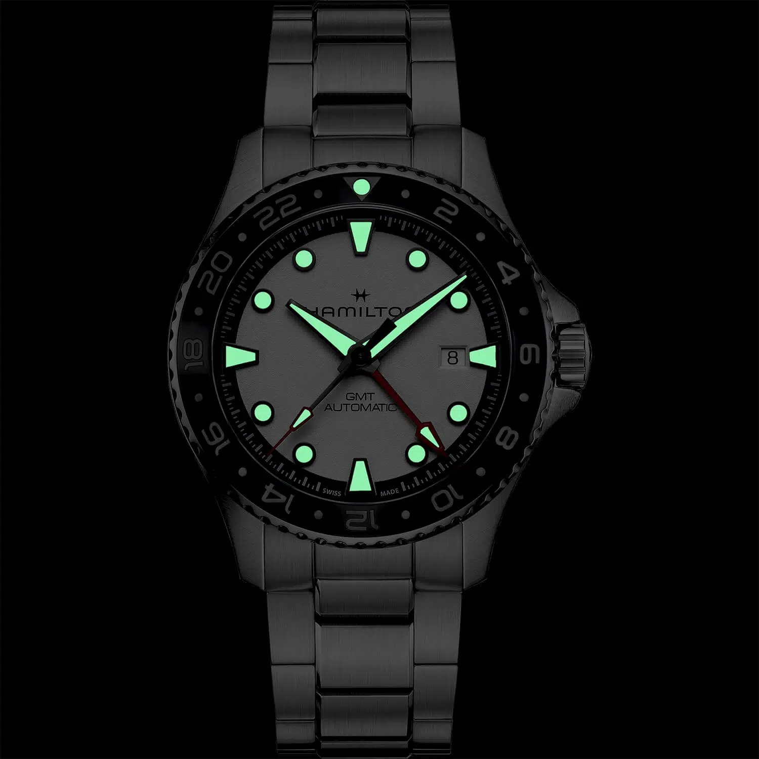 At 43mm, the stainless-steel case makes a statement and is complemented by a silvery-white sandblasted dial with light green accents. The watch is powered by automatic Caliber H-14 movement and an 80-hour power reserve. The matching stainless-steel bracelet with a folding clasp complements the case perfectly, but can also be replaced with sportier materials.
