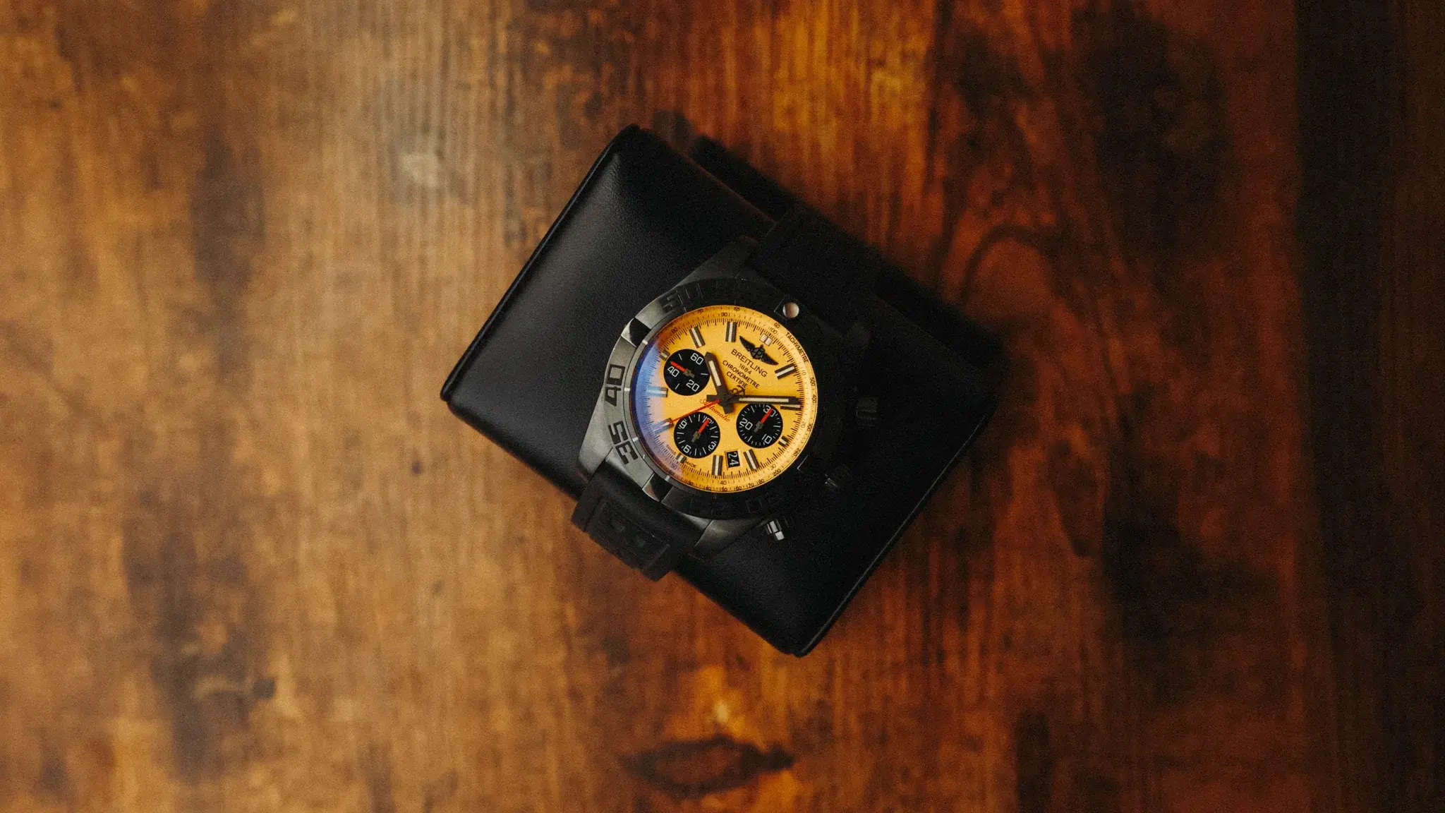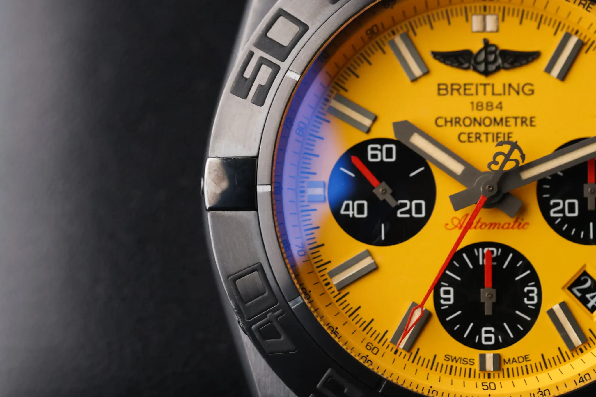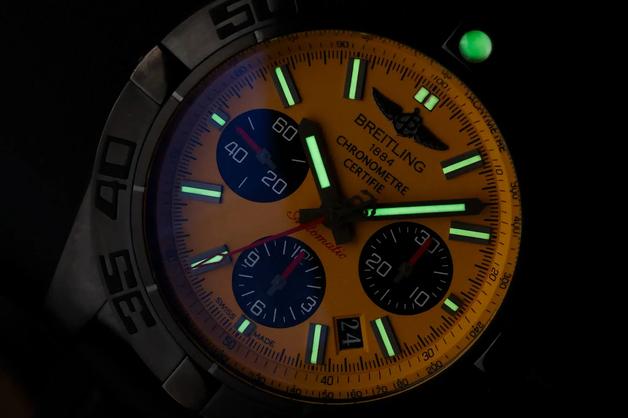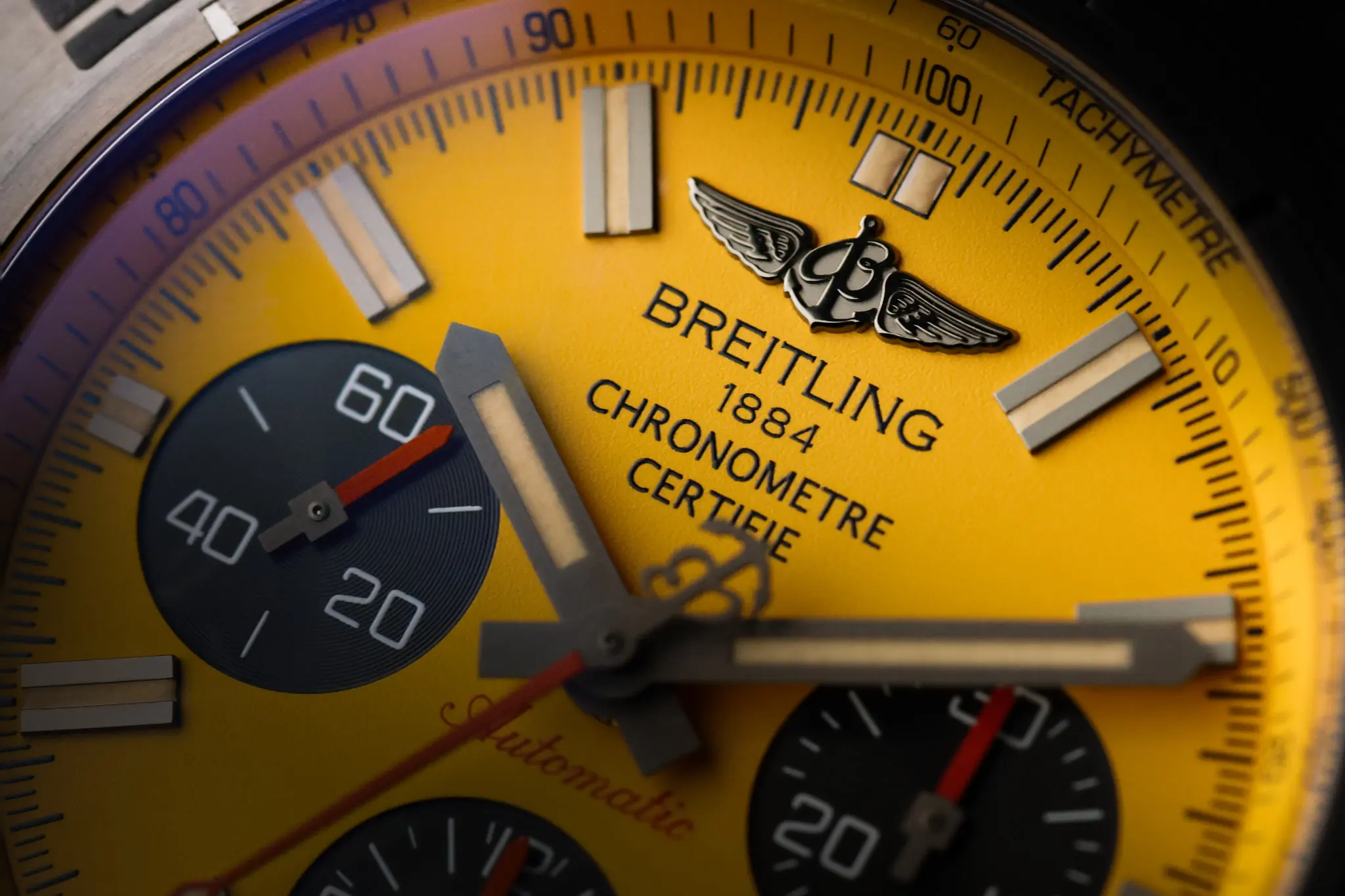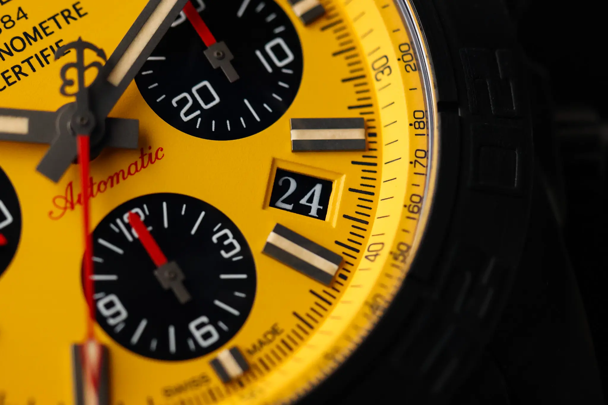 Looking at the watch, the school-bus-yellow face is the most obvious feature. Described as a mix of Breitling’s signature colors, Intrepid Orange and Cobra Yellow, it gives the watch a sporty look, enhancing its unapologetic appearance. It offers high contrast against a DLC-coated carbon stainless steel case and deep black subdials, making it difficult to ignore.