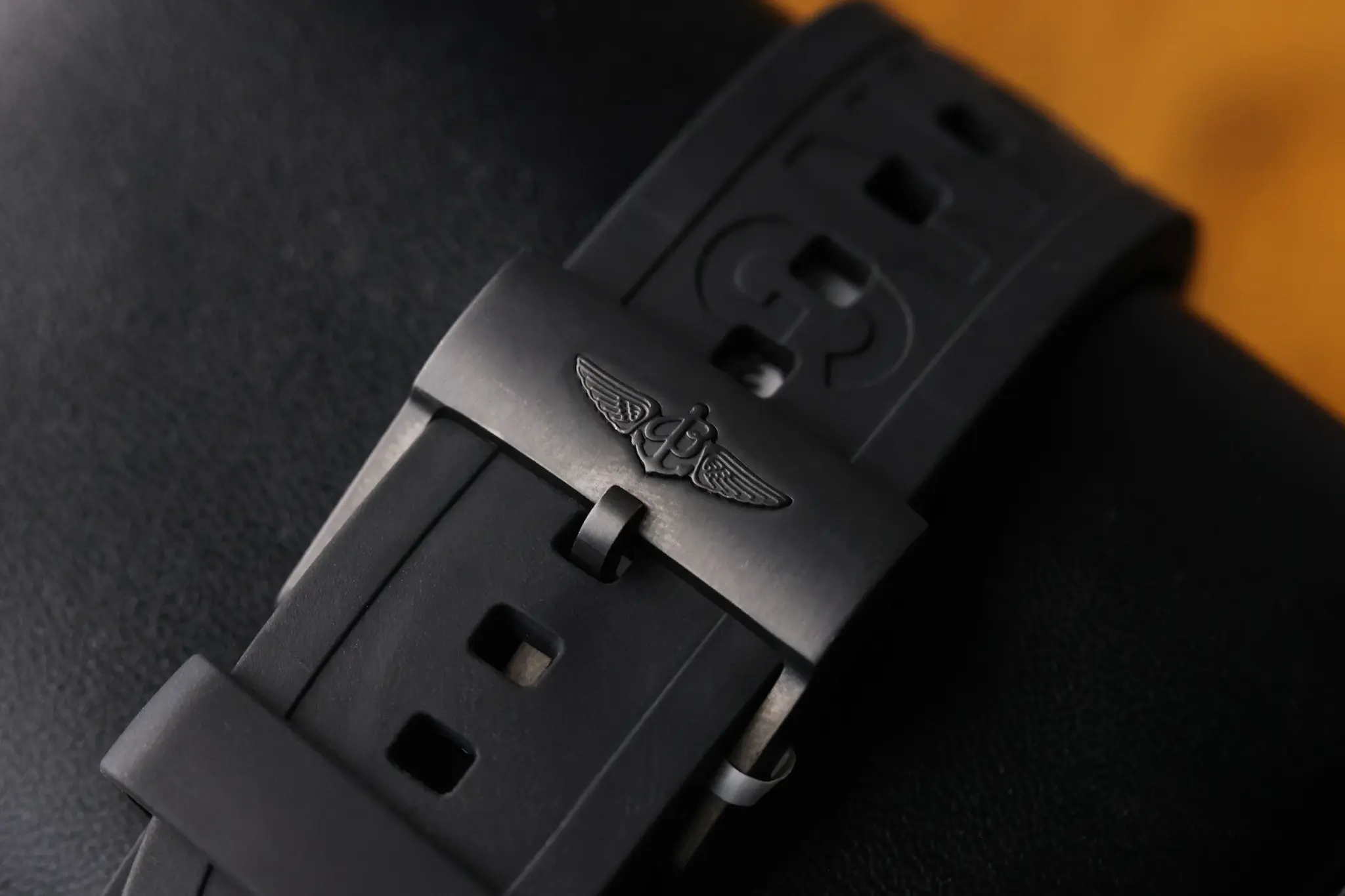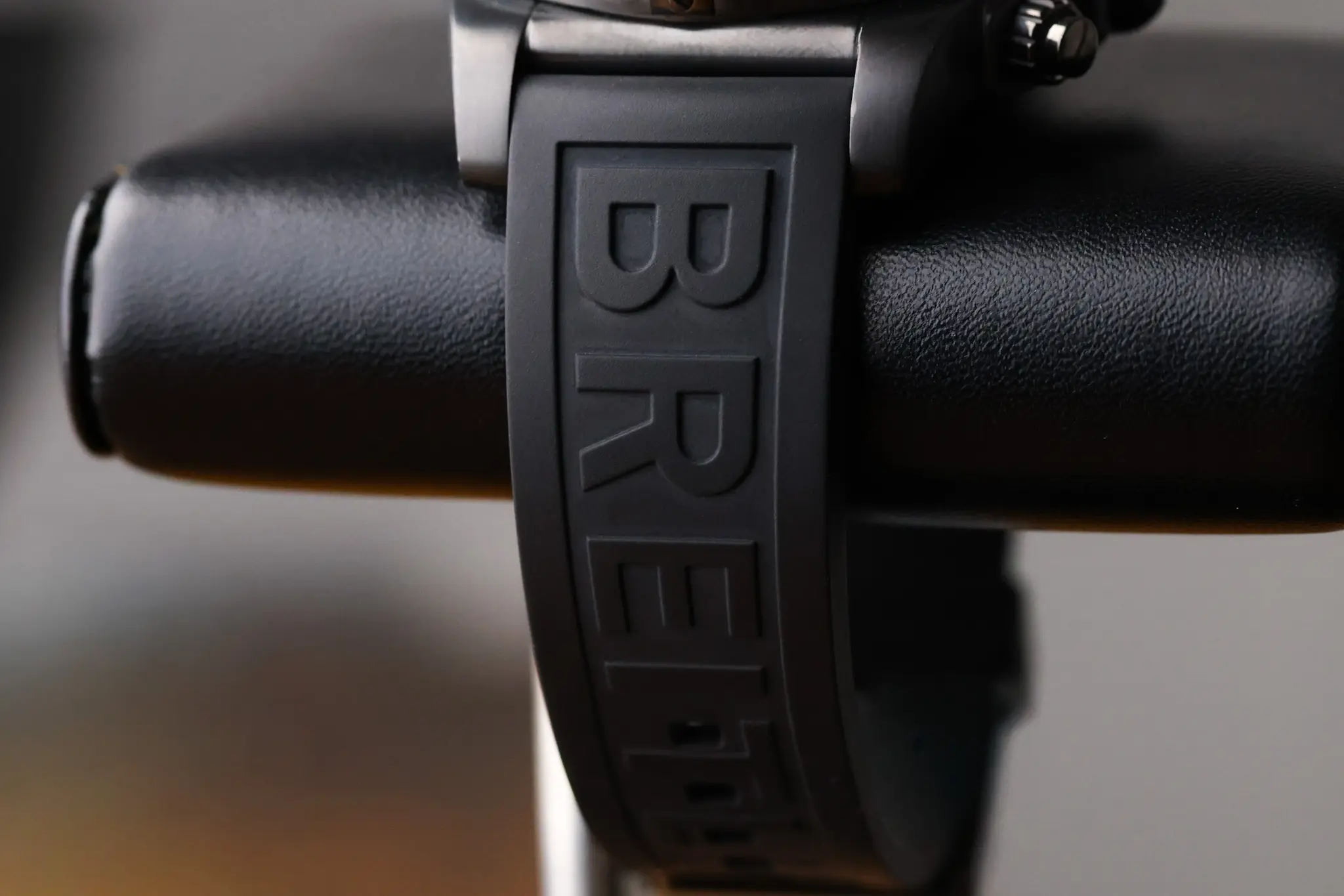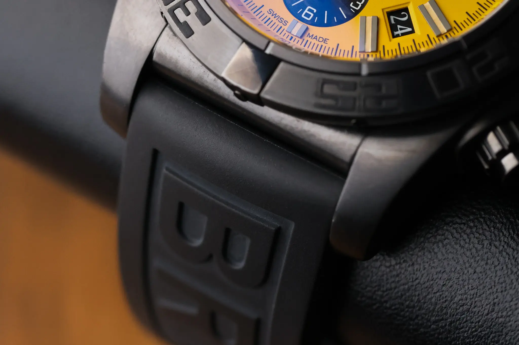 Aesthetics-wise, its bold black color offsets the bright yellow nicely. A bold Breitling logo is engraved into the material, complementing the athletic appearance.