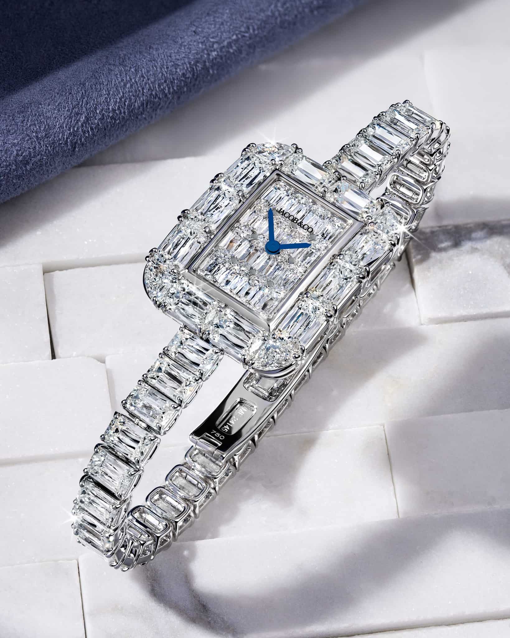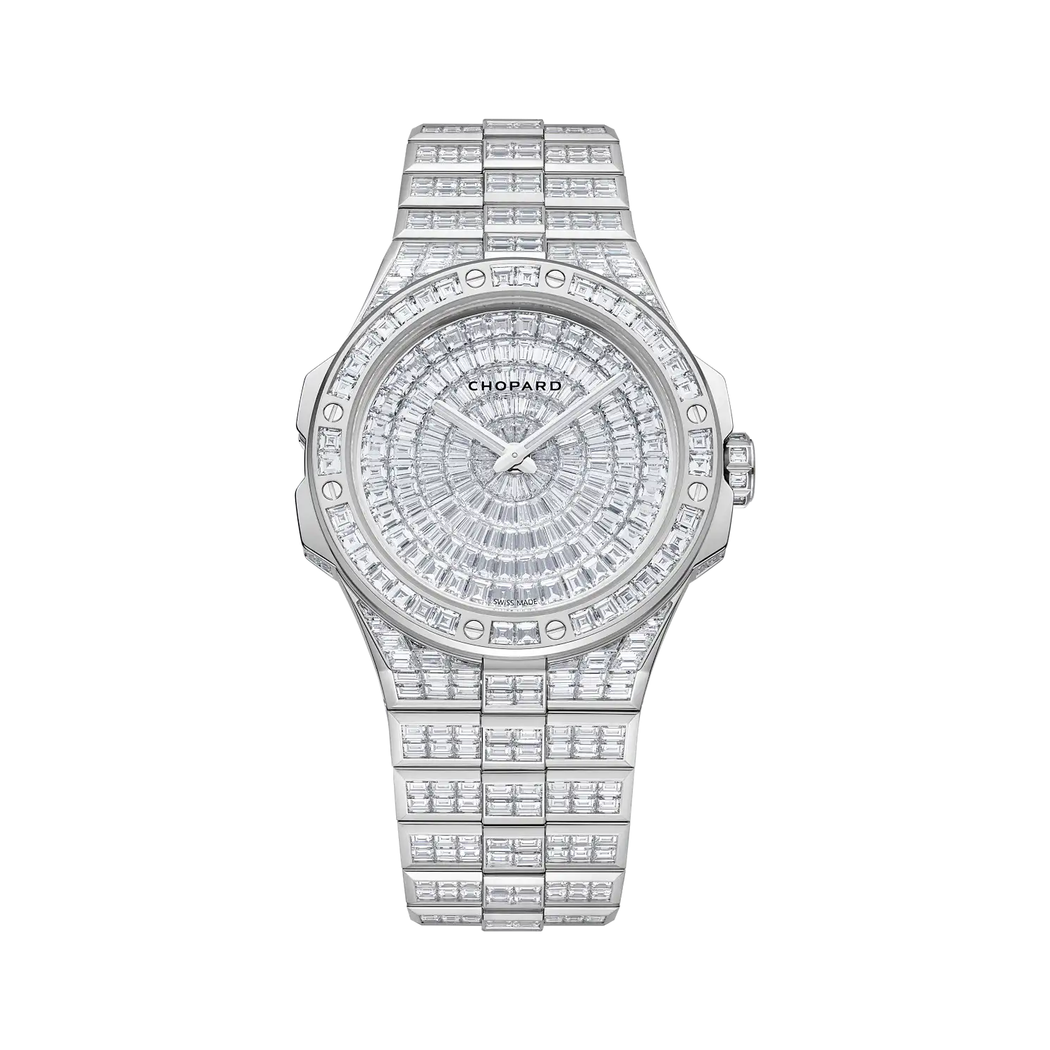 The case is based on the standard Alpine Eagle featuring a rounded bezel with eight screws and an integrated bracelet with wide center links. The white gold supports the ‘frozen’ aesthetics. Hands and indices are kept legible with polished-metal framing, but at this level of glamour, is telling time truly important?