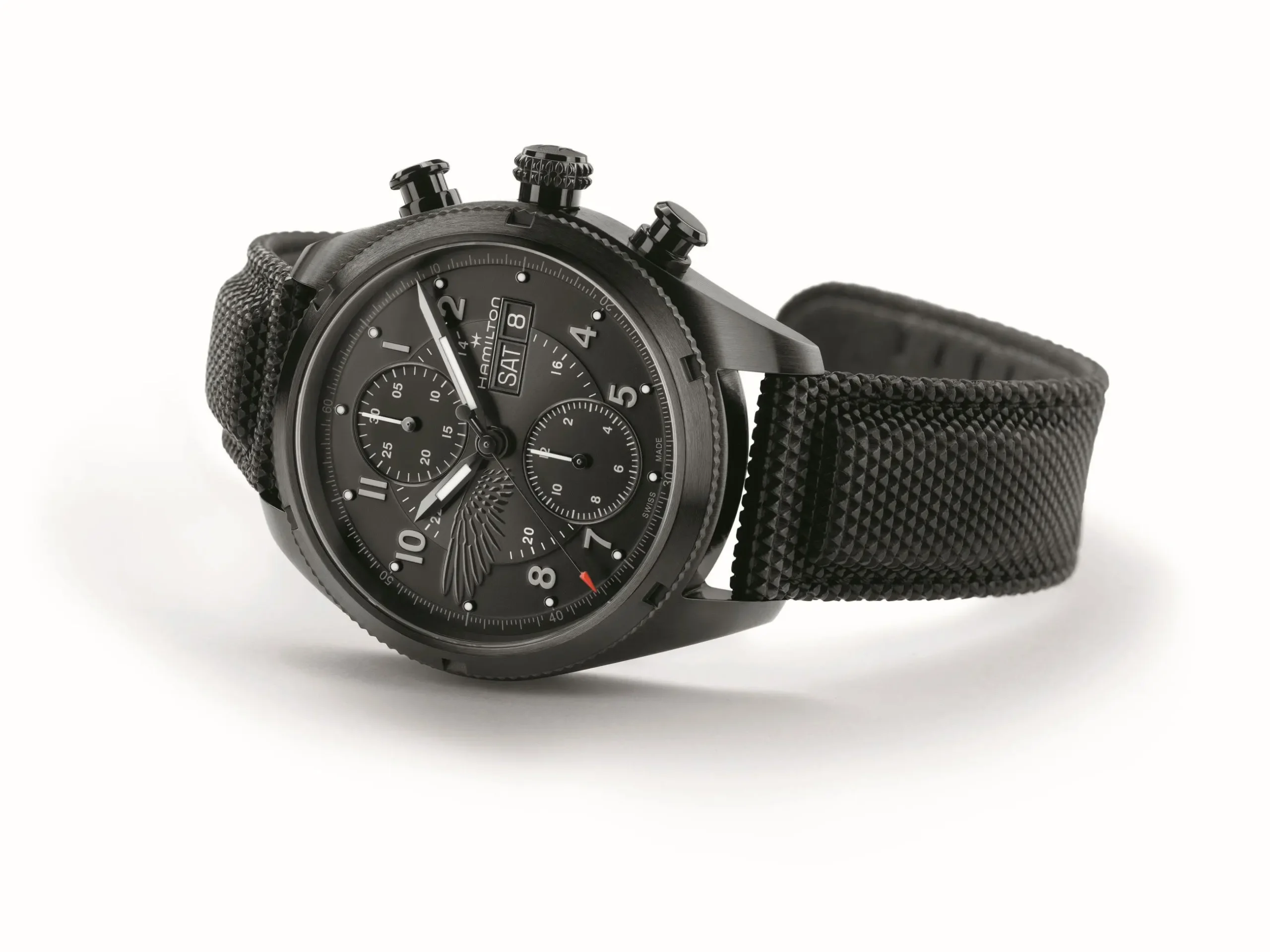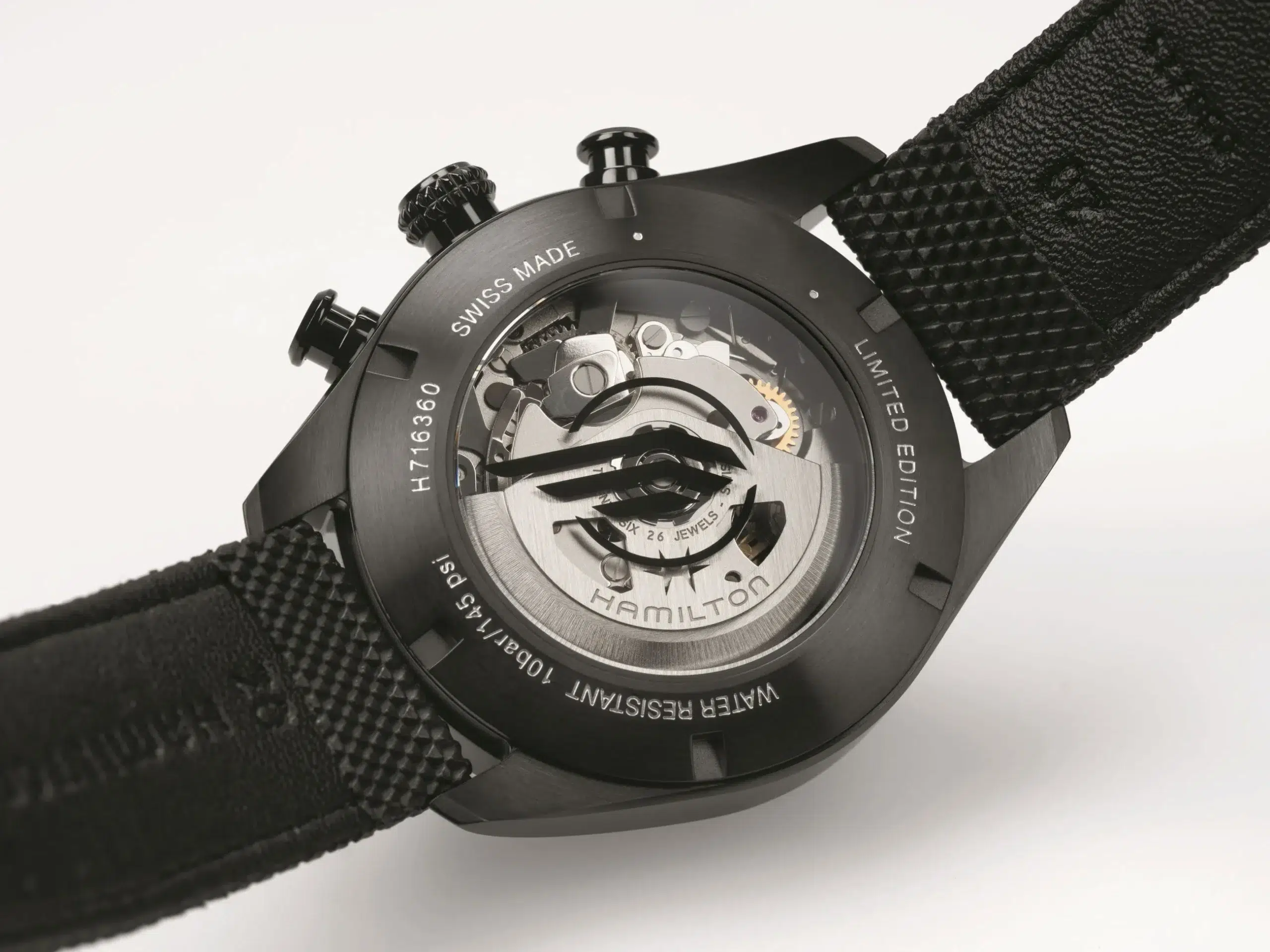 Although this is definitely a tool watch, it features an exhibition caseback with an emblem representing prayers for the fallen, which keeps with the military theme. It reveals the H-21 automatic chronographer movement, powered by a Nivachron balance spring. Other features include a 60-hour power reserve and 100 meters of water resistance.