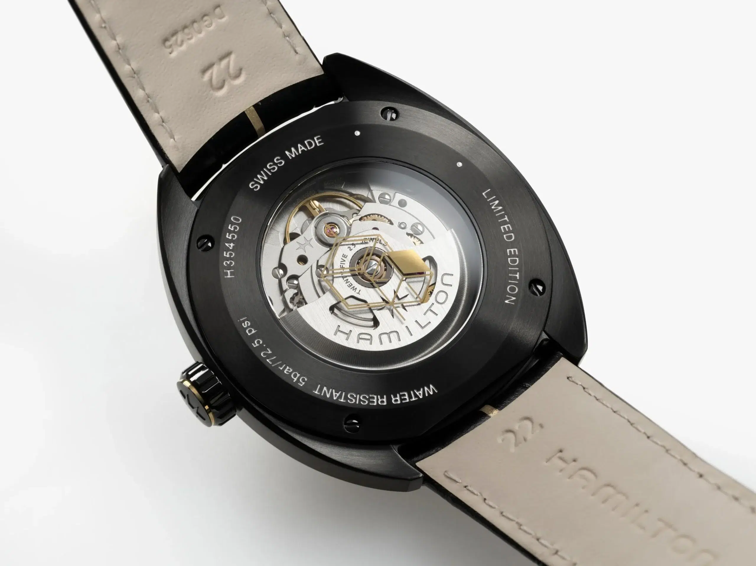 Turning the watch over, you see an exhibition-style caseback with geometric motifs. It displays the H-30 automatic movement powered by a Nivachron balance spring. The watch offers an 80-hour power reserve and 50 meters of water resistance.