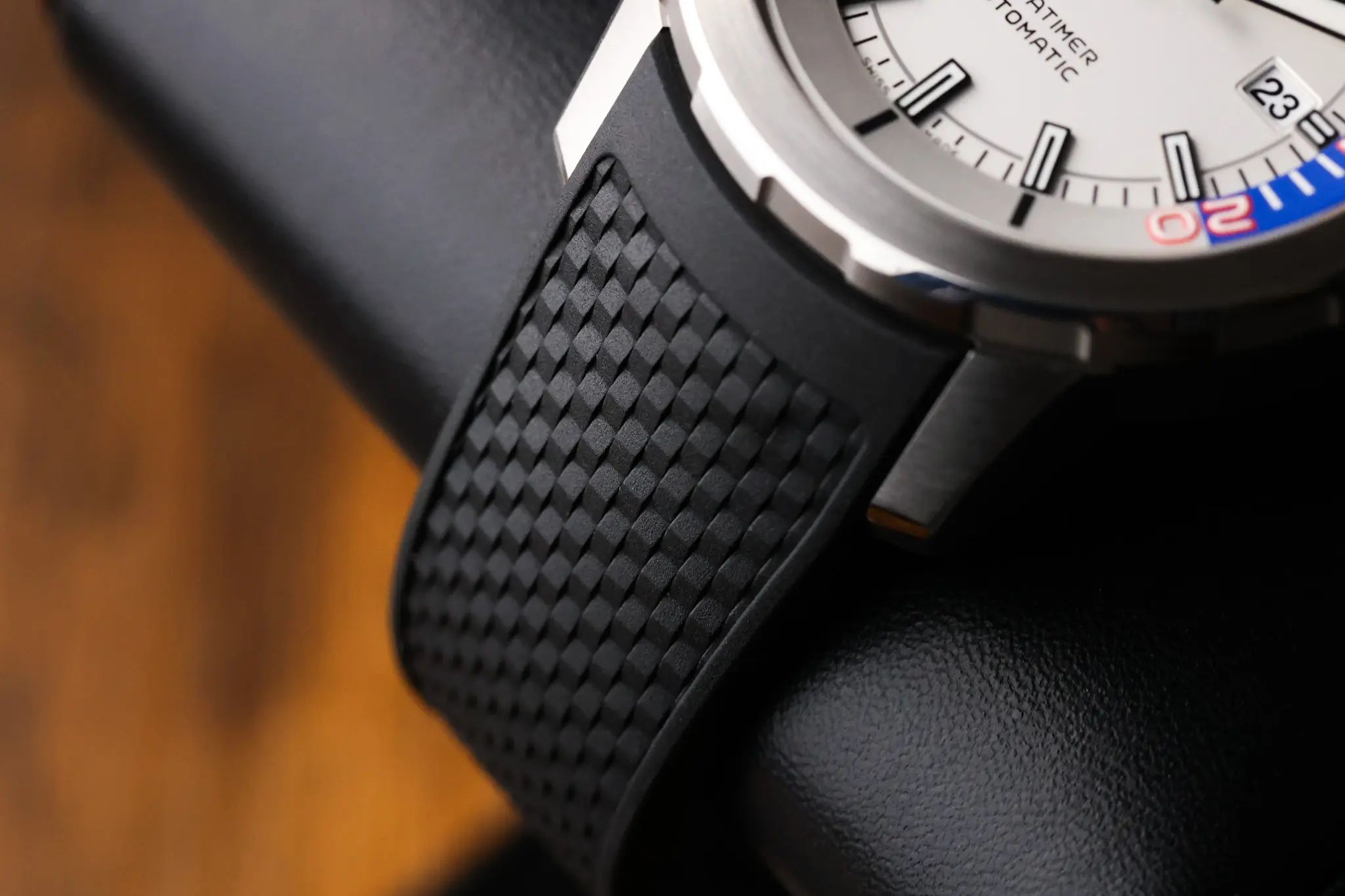 The black rubber strap contributes to the watch’s utilitarian aesthetic. The matte finish contrasts nicely with the silvery white dial. Its lightly patterned surface contributes to a technical, rather than dressy, appearance.