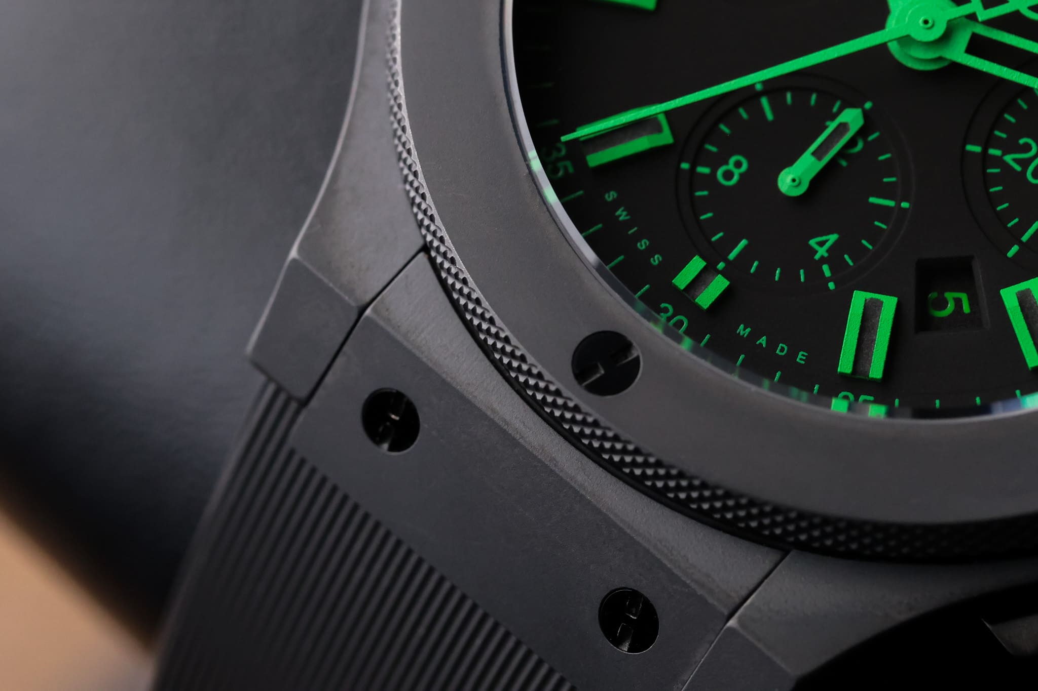 The hands, markers, and details glow bright green, giving the watch a completely different personality compared to the red or white versions.