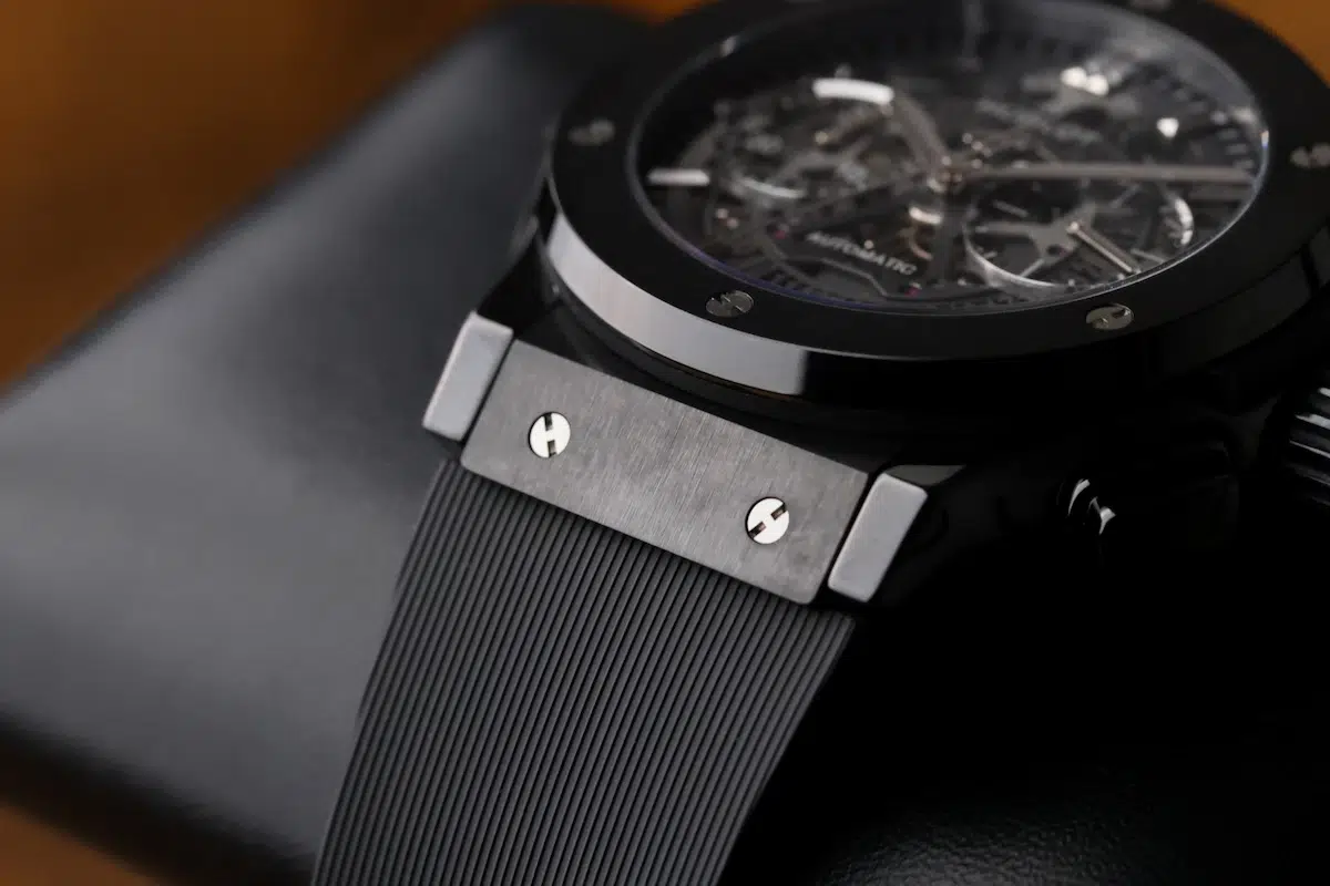 We always get excited whenever a watch from Hublot, the renowned Swiss luxury watchmaker, comes through our doors. The Hublot Classic Fusion Aerofusion is a bold, modern chronograph featuring a lightweight black ceramic case, a striking skeleton dial, and a comfortable rubber strap.