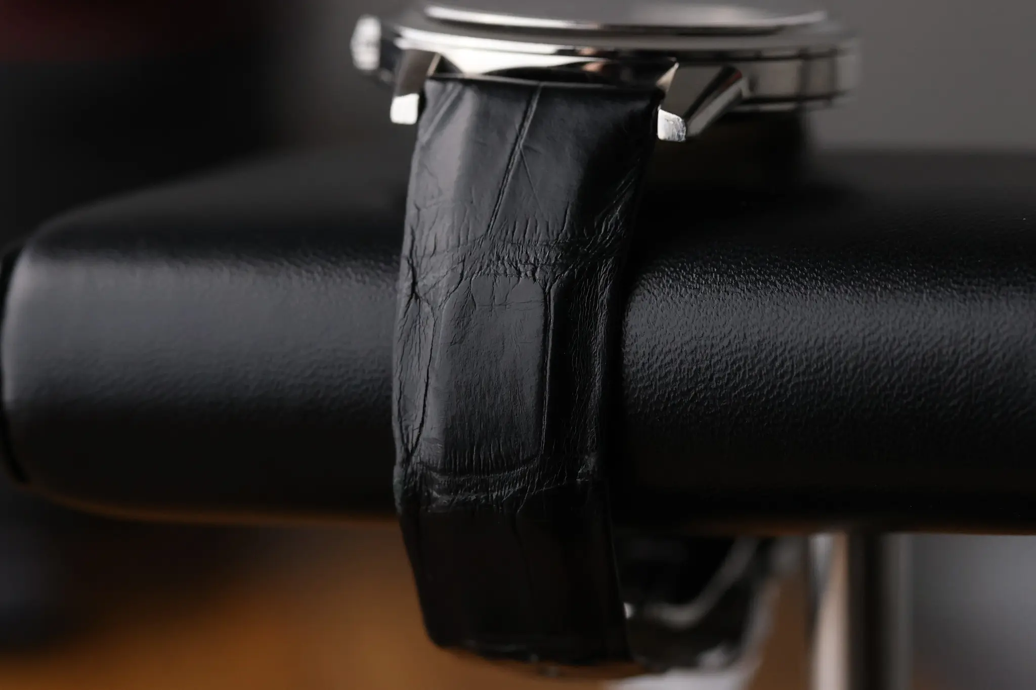The watch is complemented by a black leather alligator strap with a glossy finish. It contrasts with the white, toning down the sparkle, and preventing a look that’s too ‘sugary sweet’.