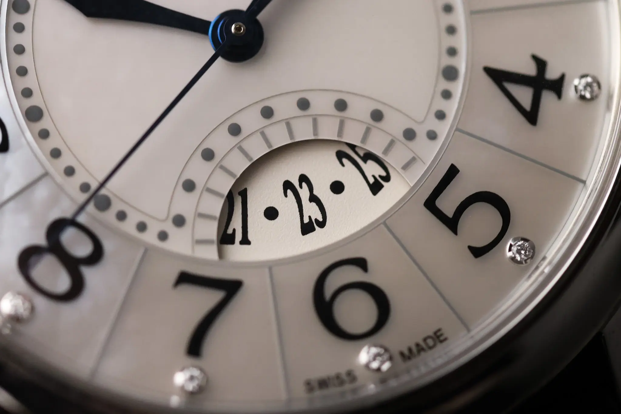 The mother-of-pearl dial is simply lovely, offering a creamy white tone with colorful accents that catch the light. The large Arabic numerals are almost calligraphic, providing a sense of whimsy, in line with the romantic, vintage-inspired theme. Each is accented by a small diamond.