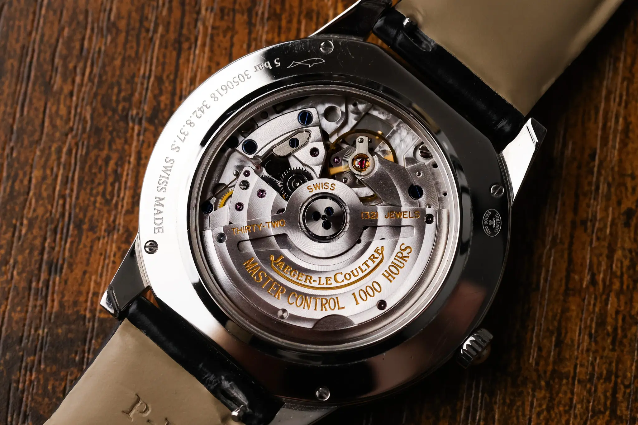 Turning the watch over, we see a sapphire display caseback, revealing the watch’s Jaeger LeCoultre Calibre 899/1 in-house automatic movement, including a skeletonized rotor and bridges with striping and perlage. The blue screws and nicely finished edges are refined rather than showy, keeping in theme with the overall design.