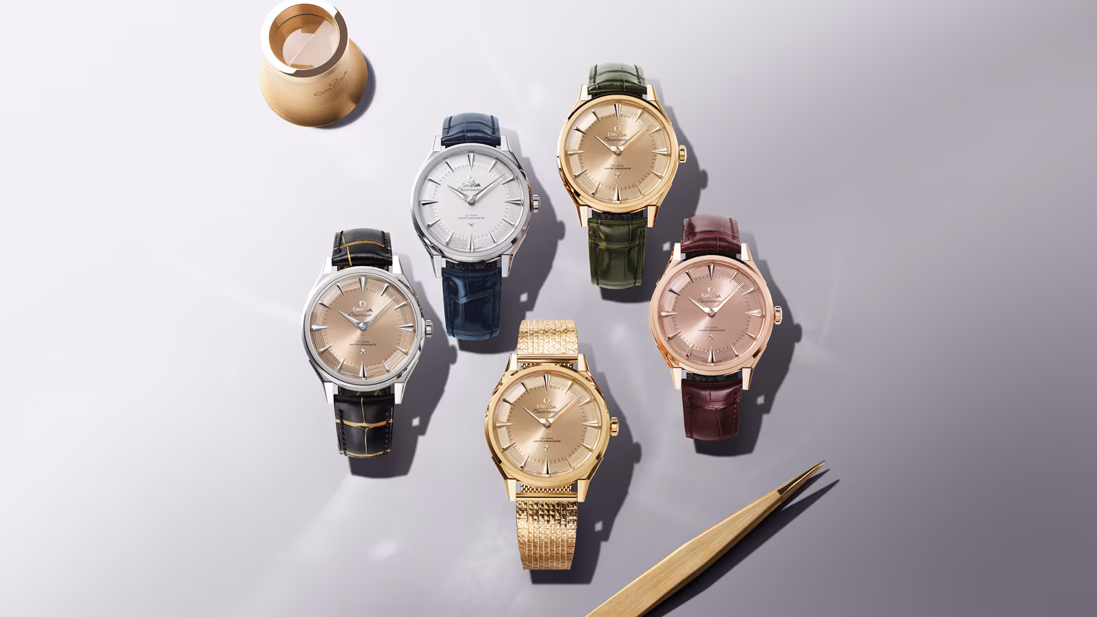 All nine references come in a 39.4mm case, with a thickness of 12.23mm and a lug-to-lug measurement of 47.2mm. That makes the watch modern in footprint, even if the styling is clearly heritage-driven. The lineup includes O-MEGASTEEL, 18K Sedna Gold, 18K Moonshine Gold, 18K Canopus Gold, and a Platinum-Gold edition, giving the collection a broad spread from relatively accessible steel to full precious-metal flex.