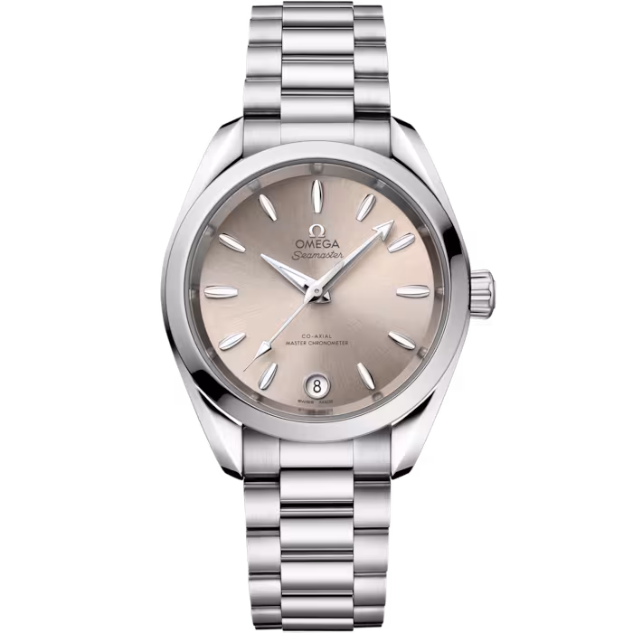 The women’s Omega Aqua Terra is available in 30mm, 34mm, and 38mm. The 30mm sits at the more compact, jewelry-adjacent end of the range. The 34mm is the most balanced everyday size. The 38mm is a more watch-forward option for women who prefer sportier proportions on the wrist.