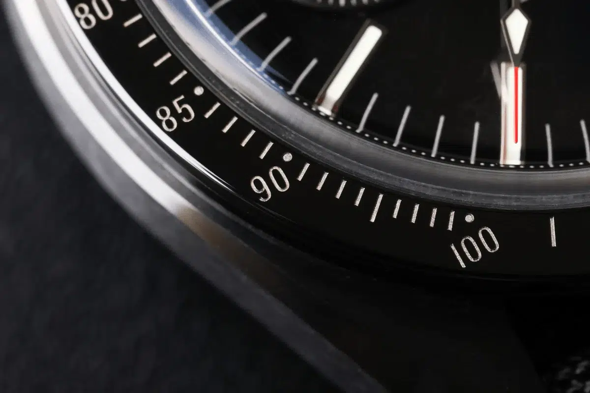 One of the most eye-catching details on the Dark Side of the Moon is its dial. The ultra-black background meets the moon’s surface texture, created with laser ablation, to bring the satellite to life. Adding to the depth of the watch, the polished indices and white Super-LumiNova-filled hands provide perfect contrast for legibility, no matter the hour.