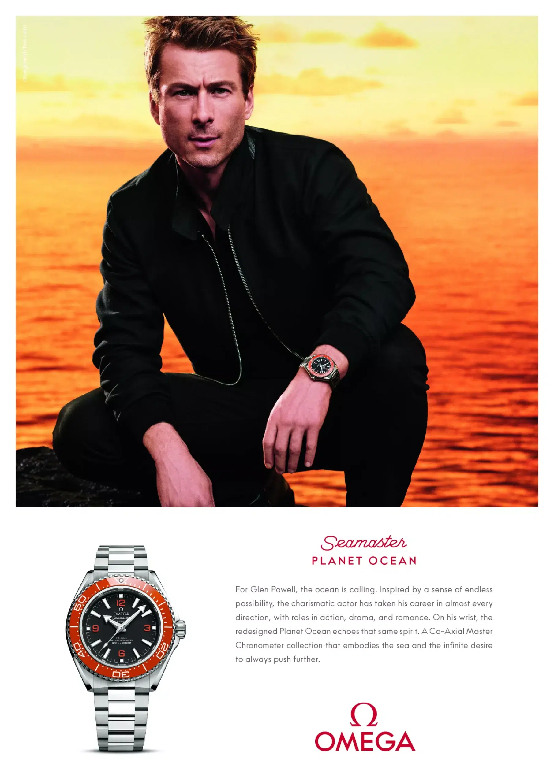 Glen Powell is one of Omega’s newest brand ambassadors, representing a new generation of Hollywood talent. Best known for Top Gun: Maverick and Twisters, Powell has been closely associated with the Omega Seamaster Planet Ocean, wearing the model during promotional events and campaigns. His partnership reflects Omega’s balance of modern performance, rugged design, and cinematic presence.