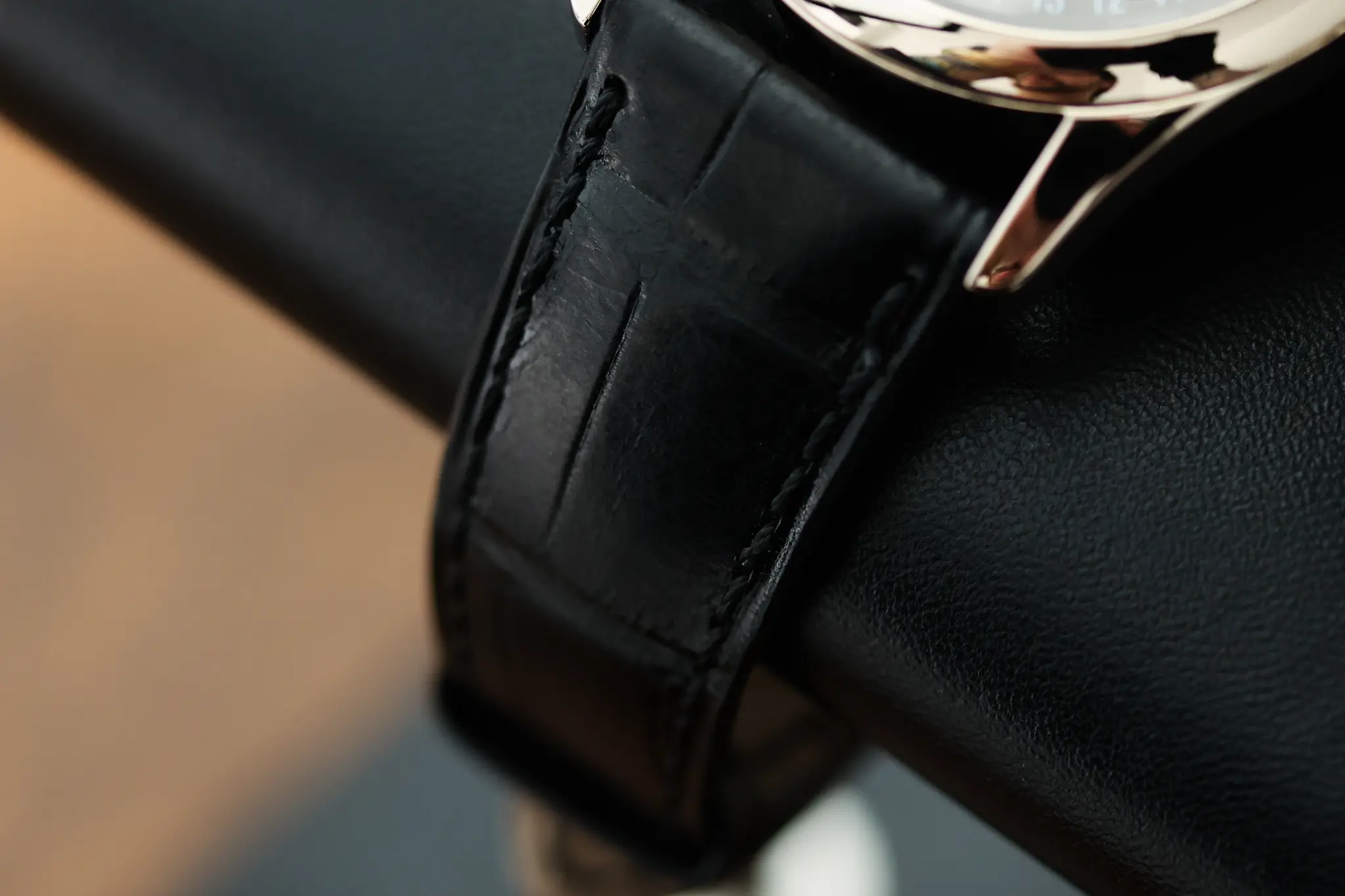 The black leather strap keeps the watch grounded. It frames the case cleanly and stops the dial from drifting too far into novelty. The white gold deployant clasp carries the Calatrava cross, a small but considered detail that ties the strap back to the watch’s identity rather than treating the buckle as an afterthought.