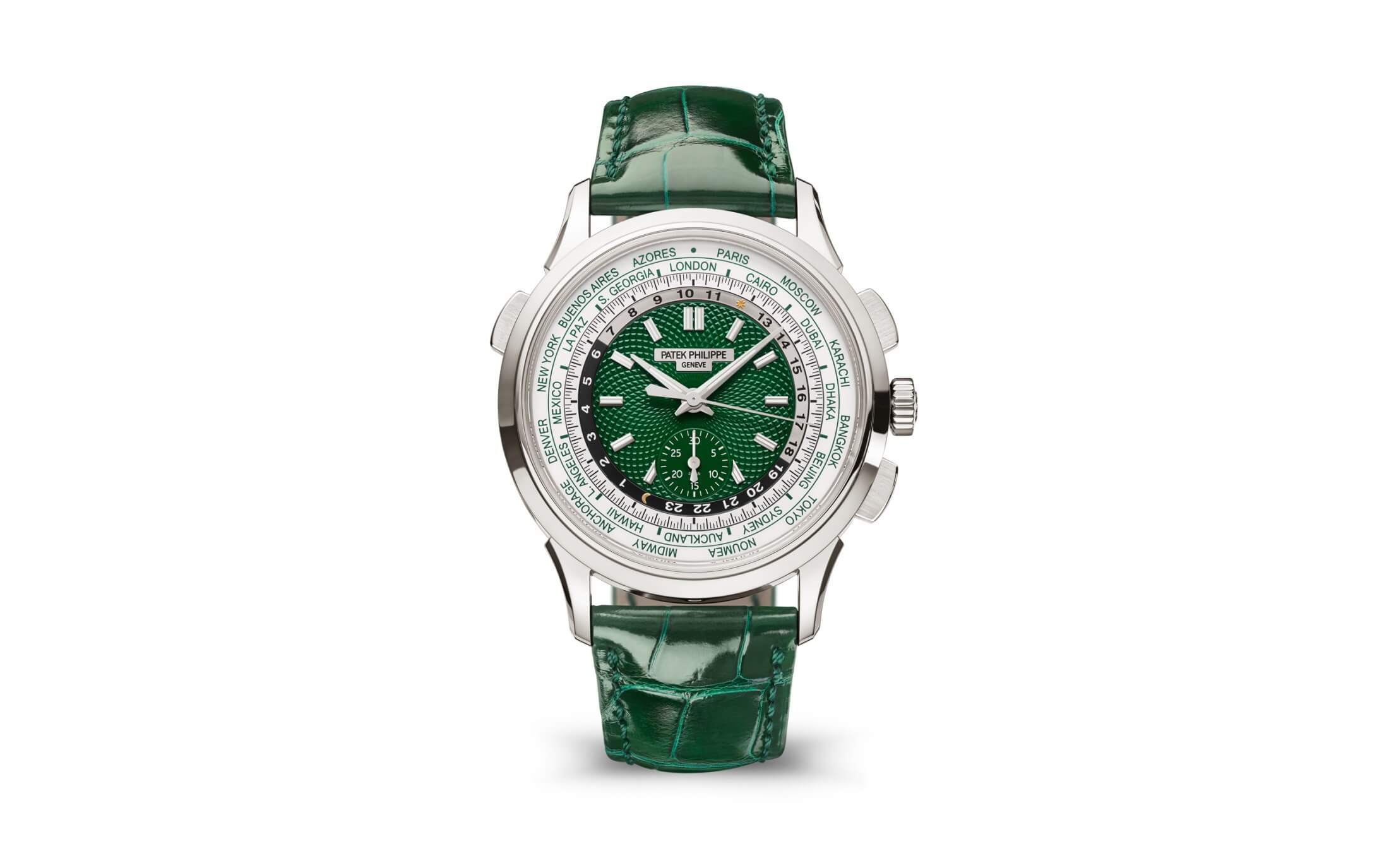 Lastly is the 5930P-001 self-winding world time flyback chronograph. This piece combines two complications by way of the CH28-520 HU caliber. The platinum case houses a green dial that tracks 24 time zones and comes on a matching green leather strap. This new trio represents remarkable watchmaking and the refined elegance that Patek Phillipe is known for.