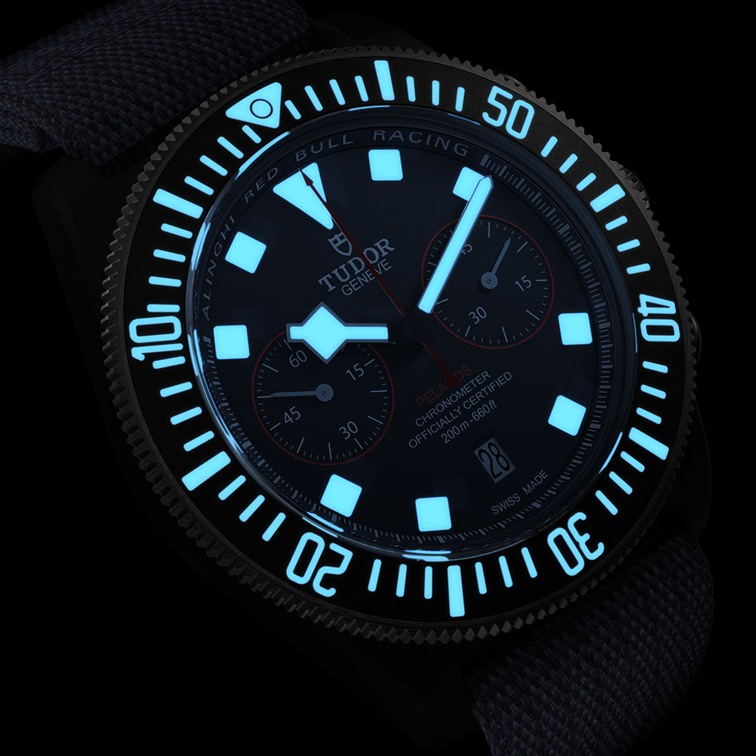 The matte blue dial surrounded by the dark matte black carbon case and contrasting titanium pushers and crown create a captivating look. With or without the association with Alinghi Red Bull Racing, these new timepieces are likely to be a hit among Pelagos followers.