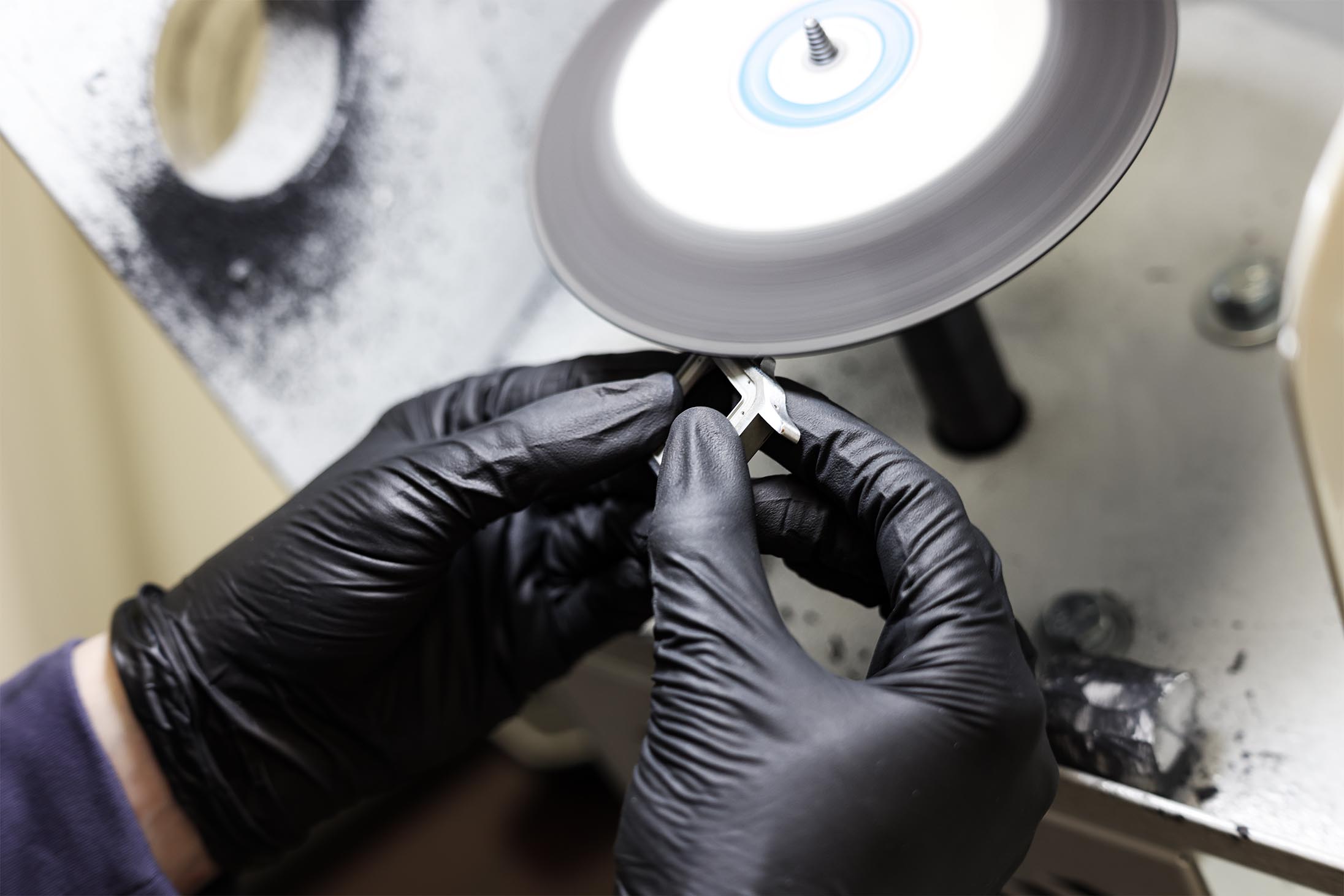 - Case Refinishing: A polishing machine with abrasive and fabric wheels removes scratches from the metal case and bracelet and restores them to their original finish.