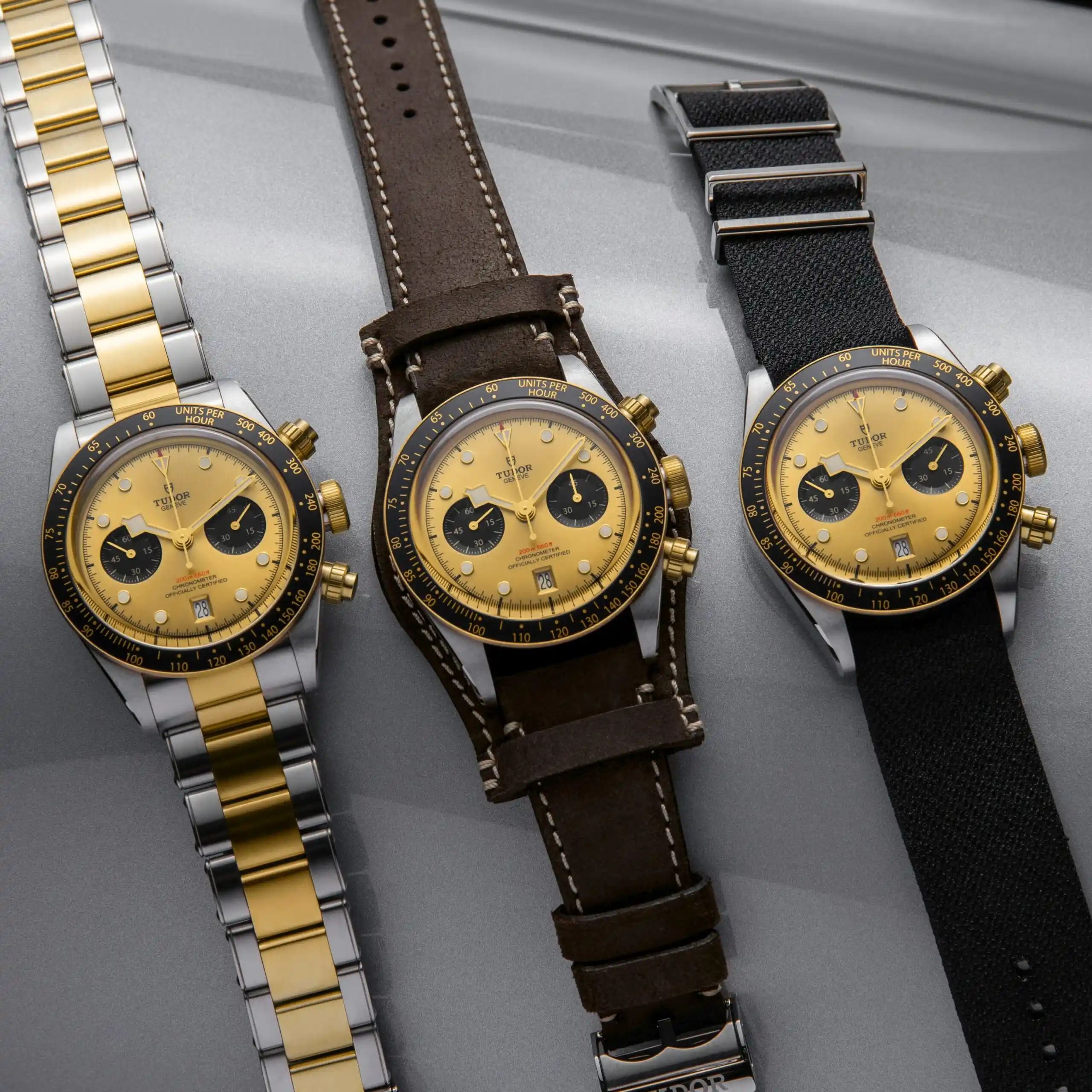 Tudor also expanded the Black Bay Chrono range by adding a new champagne dial option on the steel and gold models (previously, Black Bay Chrono S&G watches were only offered with black dials.) These new champagne dials include a pair of black registers, and the contrast not only helps in legibility but the face colorway matches the two-tone watch nicely. Other details of the new Tudor Black Bay Chrono S&G watches remain the same, which is to say they have 41mm cases, a fixed black aluminum bezel marked with a tachymeter scale, an in-house made Caliber MT5813 automatic chronograph movement, and a choice of a steel bracelet, brown leather bund strap, or black fabric strap. 2022 Tudor Black Bay Chrono S&G Reference Numbers