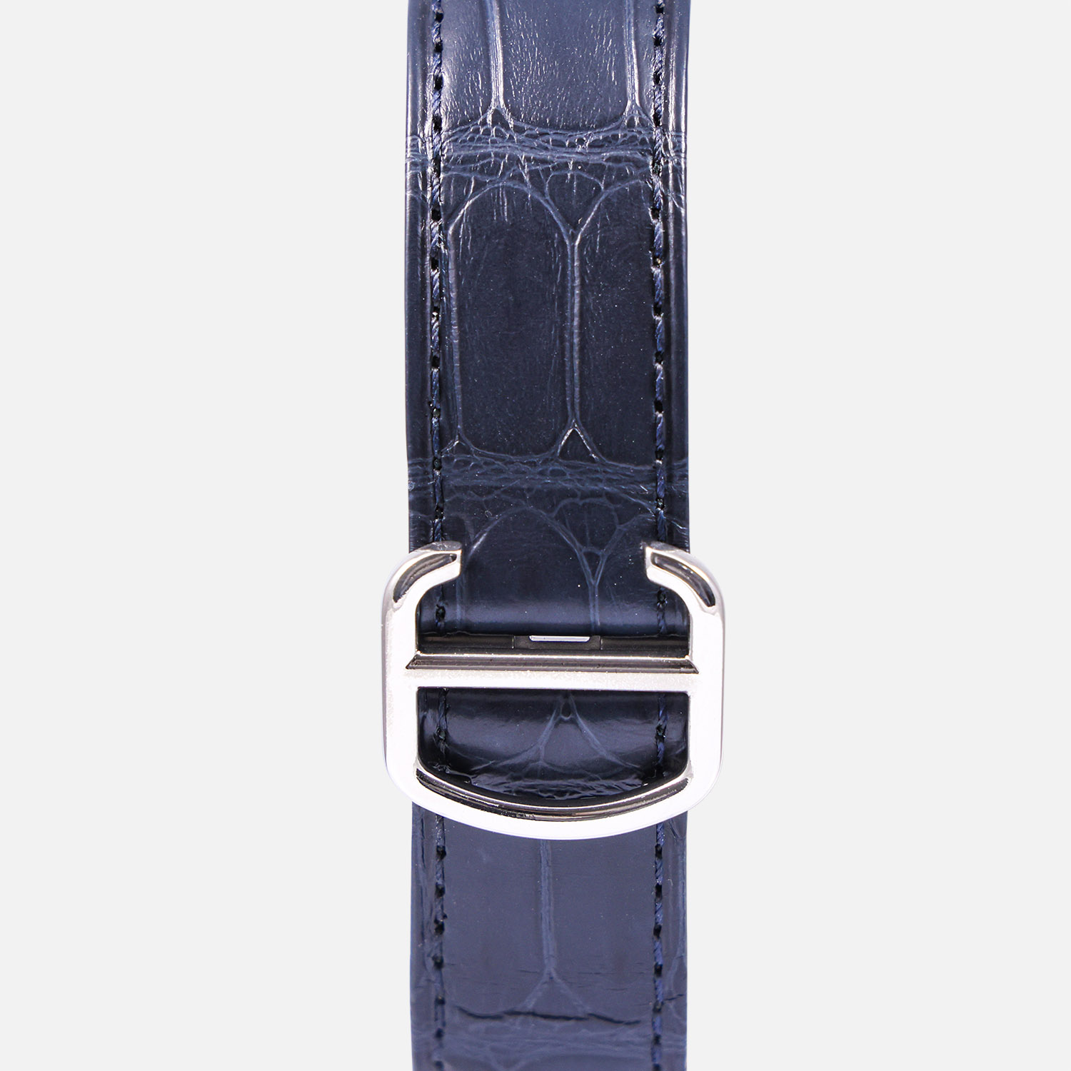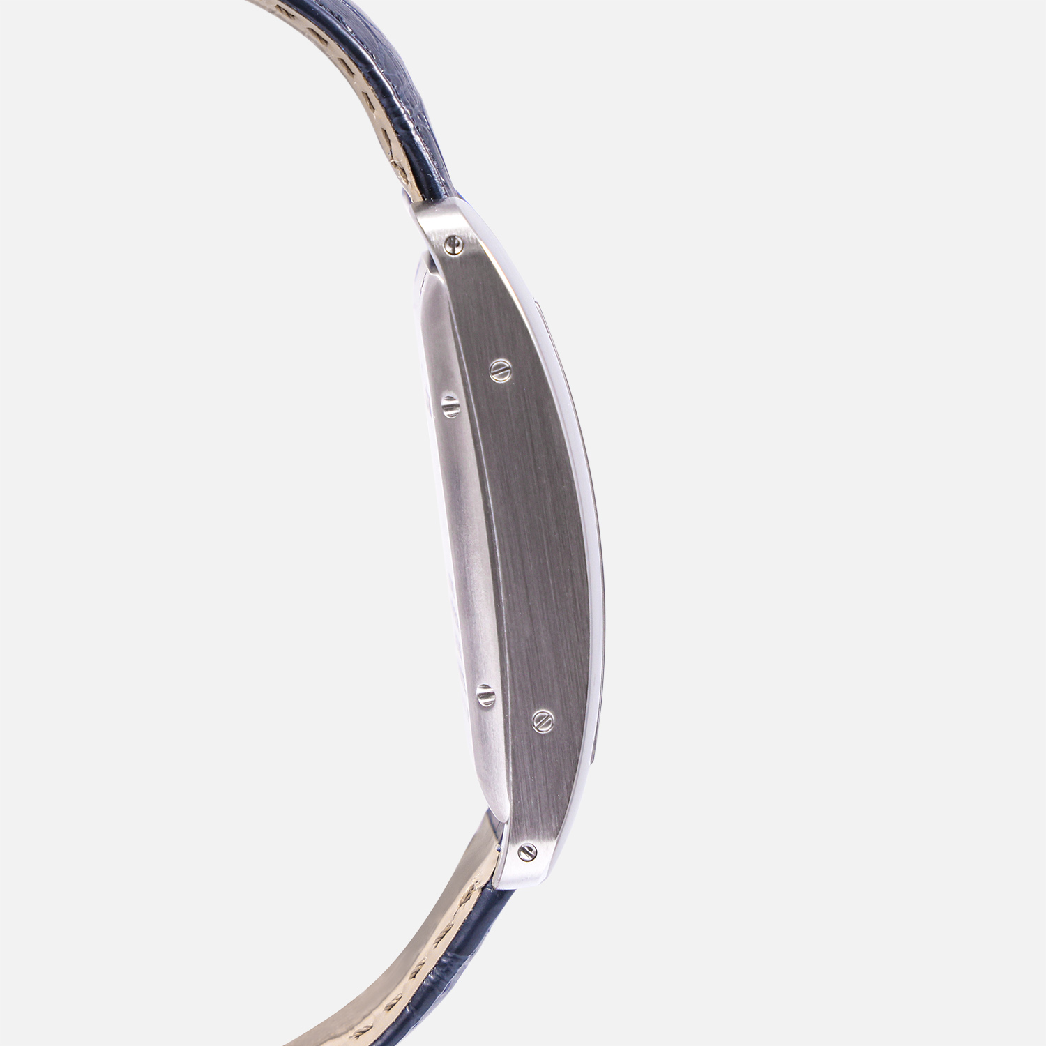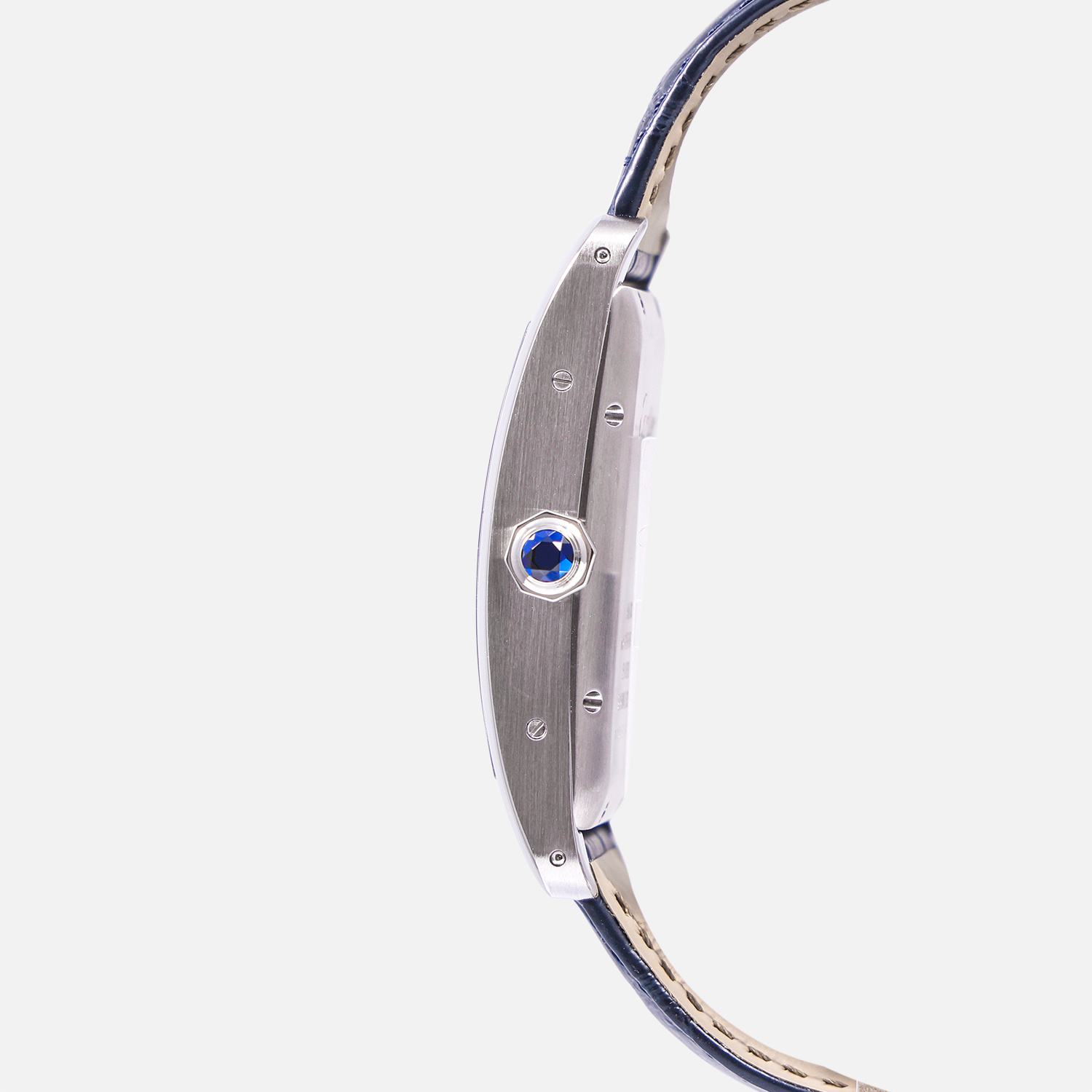 The Cartier Tank Américaine Large Model embodies timeless elegance and refined design. Featuring a stainless steel rectangular case measuring 45.1mm x 26.6mm with a slim 9.65mm profile, this watch captures the classic aesthetic of the Tank line with a modern elongated silhouette. The silvered flinqué dial showcases bold Roman numerals, blued steel sword-shaped hands, all protected by a sapphire crystal. A sapphire cabochon crown adds a signature Cartier detail.General