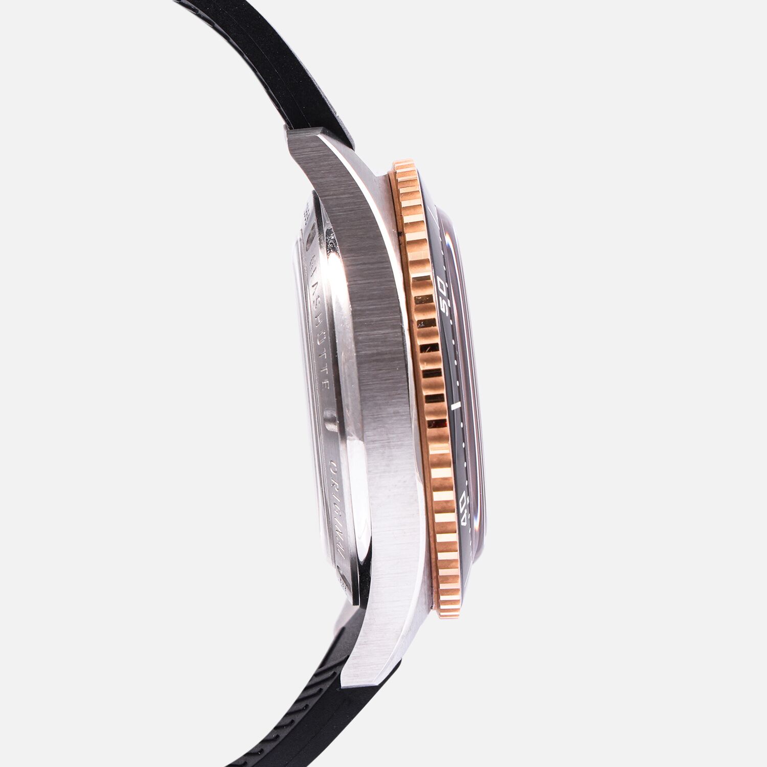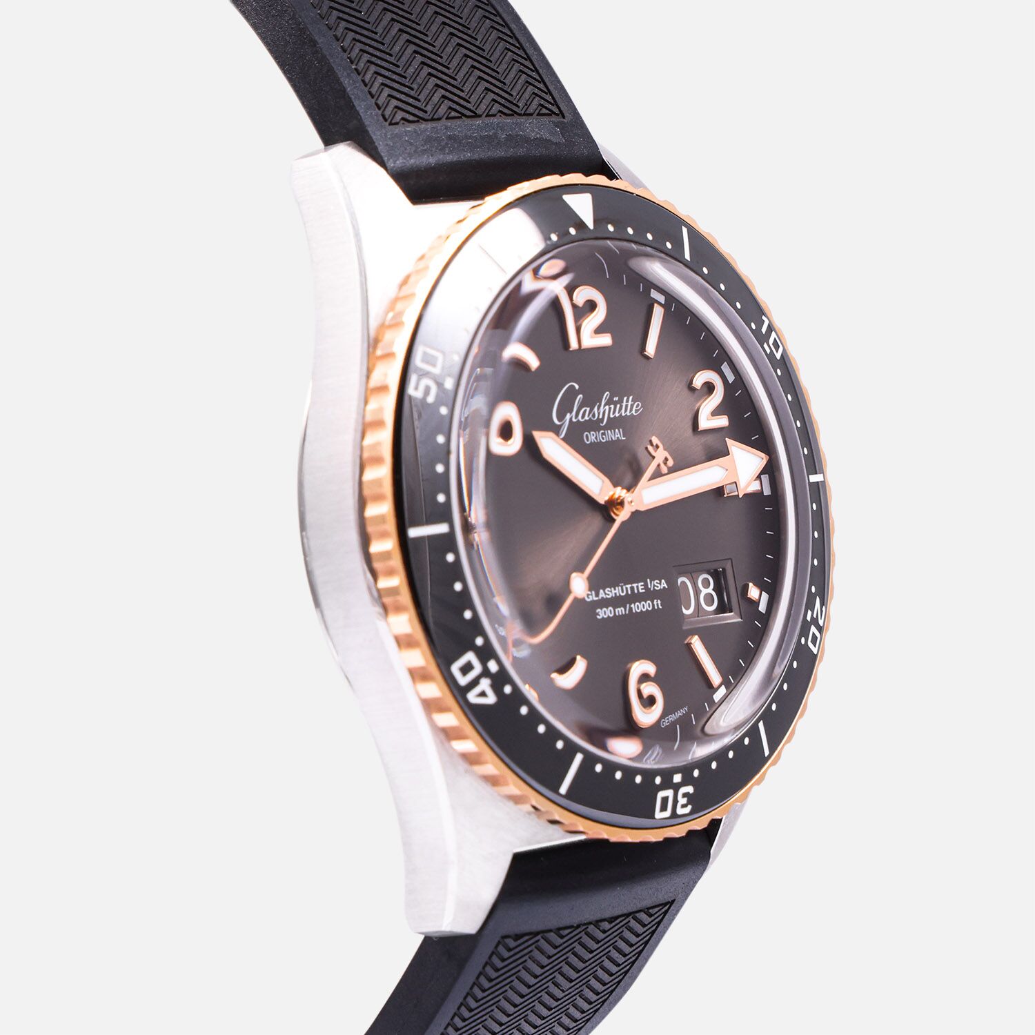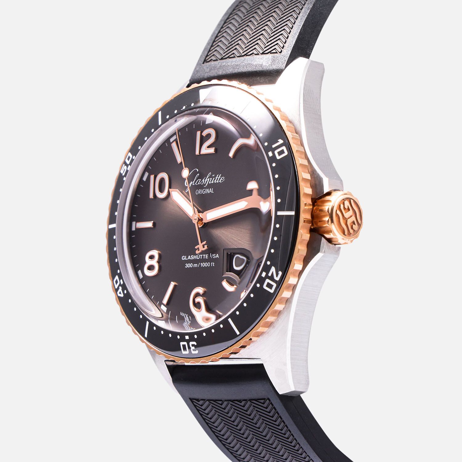 The Glashütte Original SeaQ Panorama Date Ref. 1-36-13-04-91-33 is a sophisticated diver's watch that combines robust functionality with elegant design. The 43.2 mm case is crafted from stainless steel, complemented by an 18k red gold bezel and crown, offering a distinctive bi-color appearance. The galvanized grey dial features a sunray finish, applied Arabic numerals, and indexes with Super-LumiNova, ensuring optimal legibility in various lighting conditions. The Panorama Date display is positioned at 4 o'clock, providing a clear and balanced aesthetic