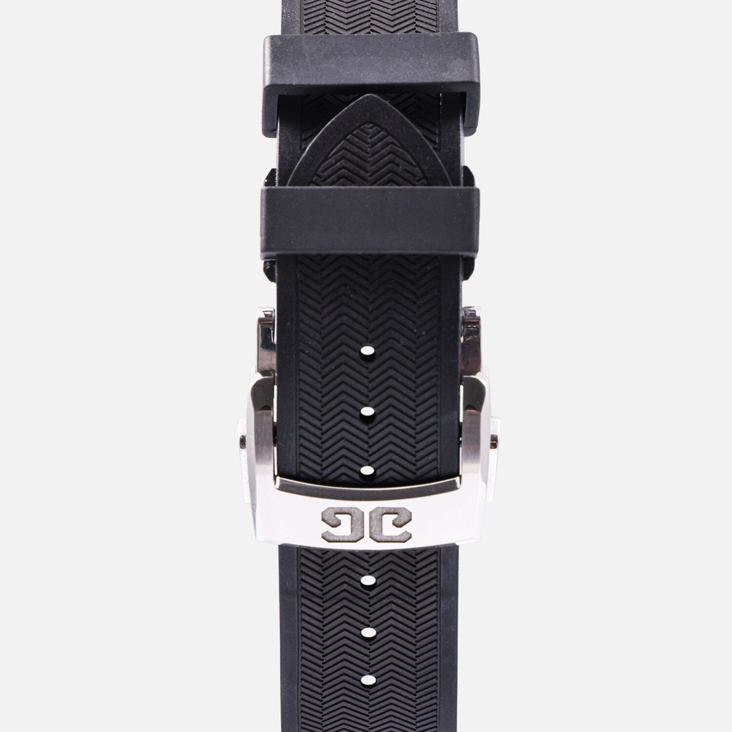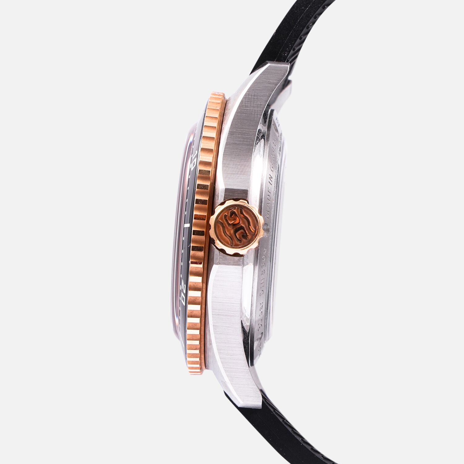 The unidirectional rotating bezel with a black ceramic inlay allows for precise dive time measurement, while the screw-down crown and centrally screwed case back ensure water resistance up to 300 meters. The watch is fitted with a black rubber strap secured by a folding clasp, offering both comfort and durability.
