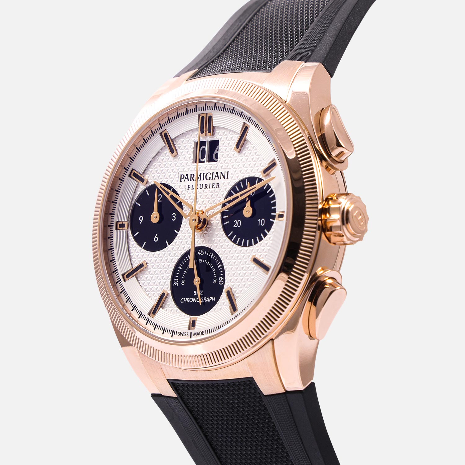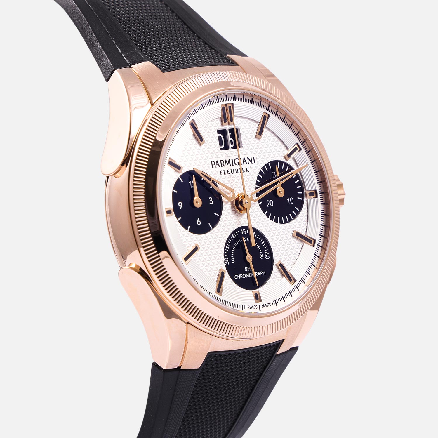 The Parmigiani Tonda GT Chronograph (Ref. PFC903‑1500140‑X01482) combines sporty elegance with high-end finishing. Its 42 mm 18 K rose gold case features a fluted bezel and a silver dial with “Clou Triangulaire” guilloché, black chronograph sub-dials, and rose-gold indices with black lume. Powered by the in-house automatic Calibre PF071, COSC-certified, it runs at 36,000 vph with a 65-hour power reserve
