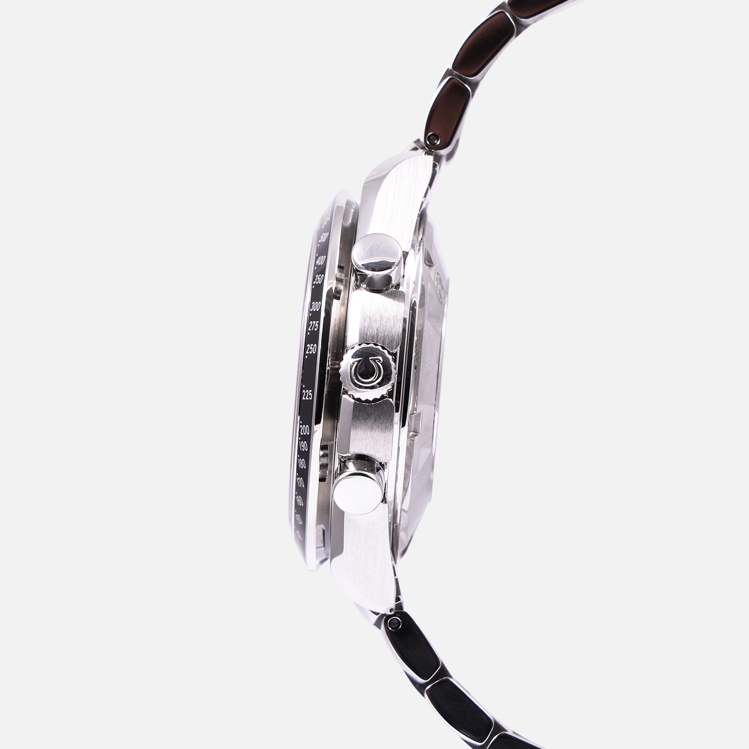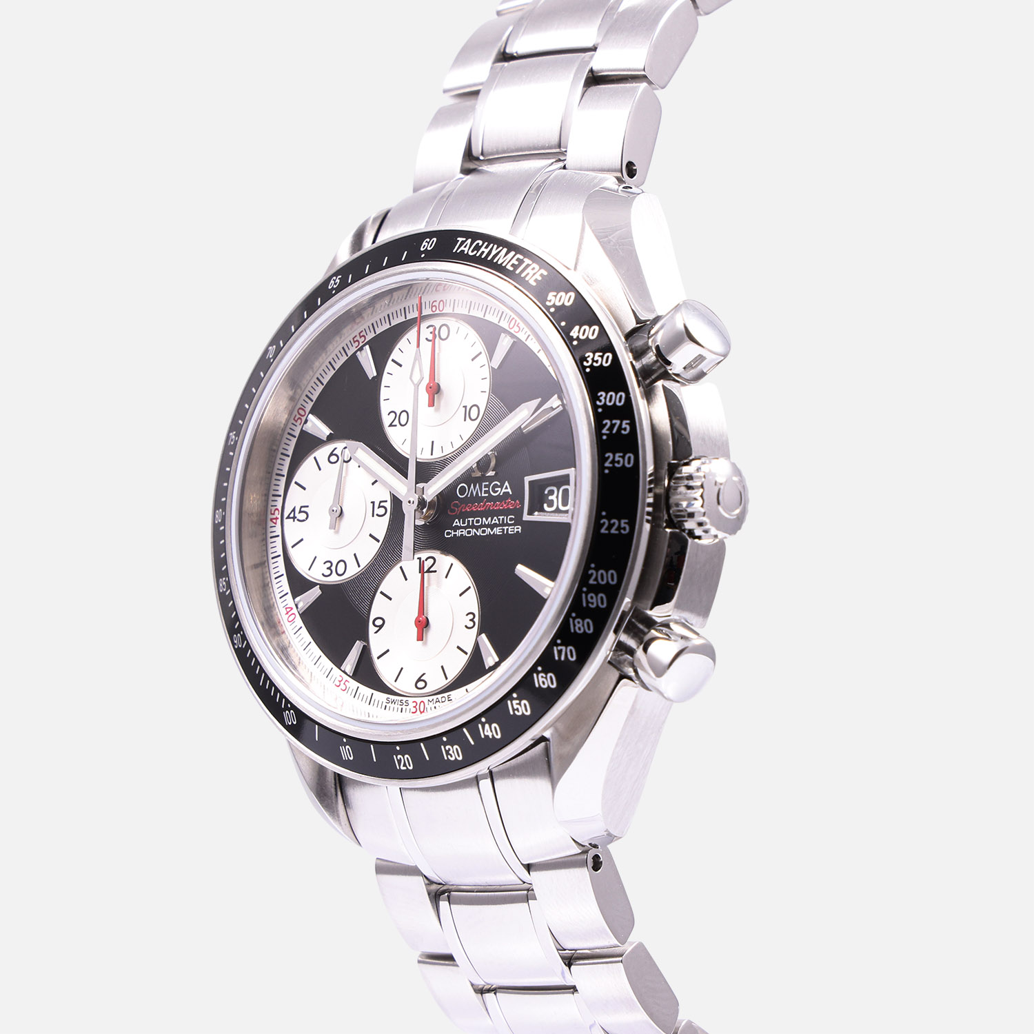 The Omega Speedmaster Date 3210.51.00 features a bold and legible black dial with contrasting silver registers and a red-tipped chronograph seconds hand. Housed in a 40mm stainless steel case, the watch offers a blend of elegance and sportiness. The automatic chronograph movement ensures precise timekeeping, while the tachymeter bezel adds a nod to the model’s racing pedigree. Durable, stylish, and functional, this Speedmaster is well-suited for both daily wear and more active pursuits.Key Features