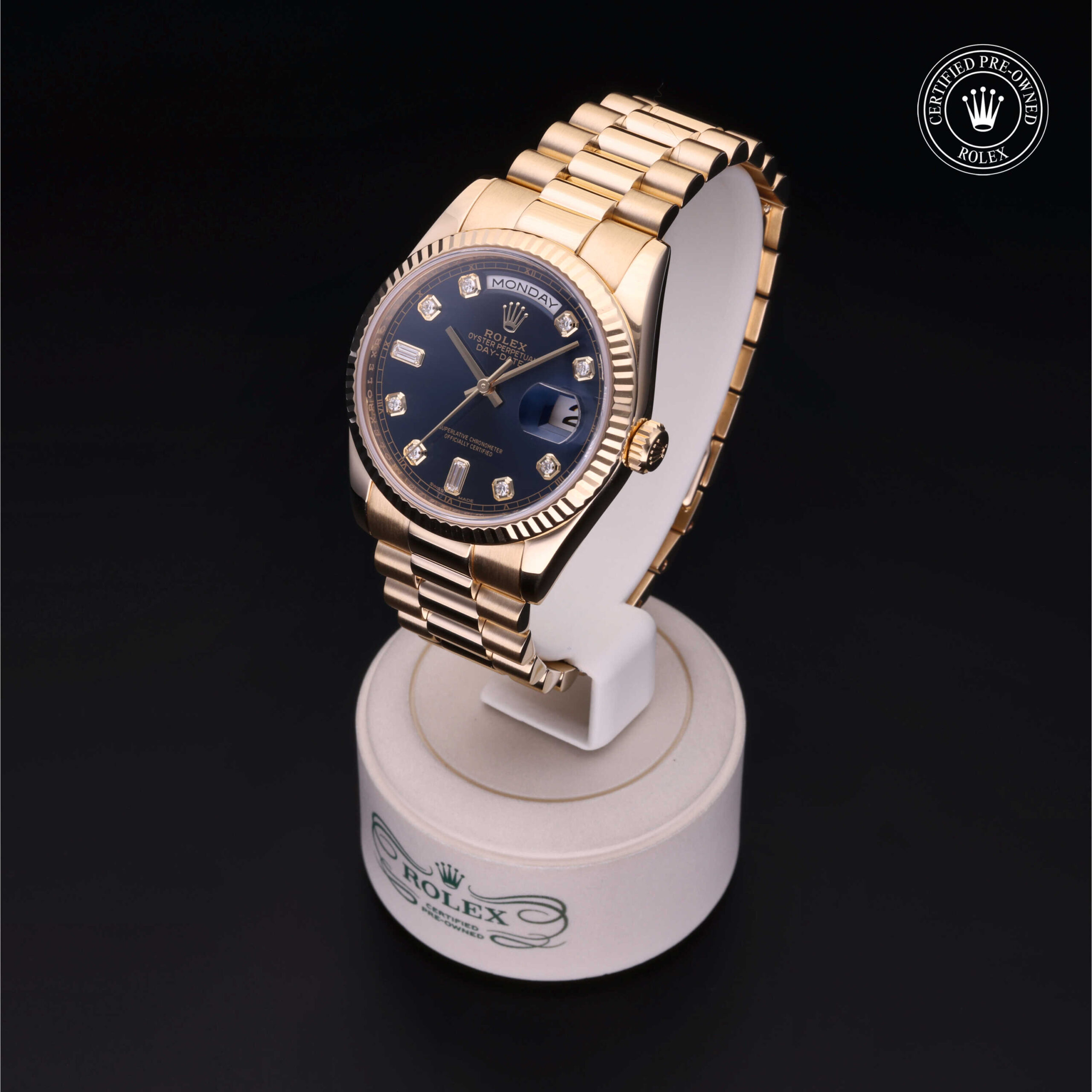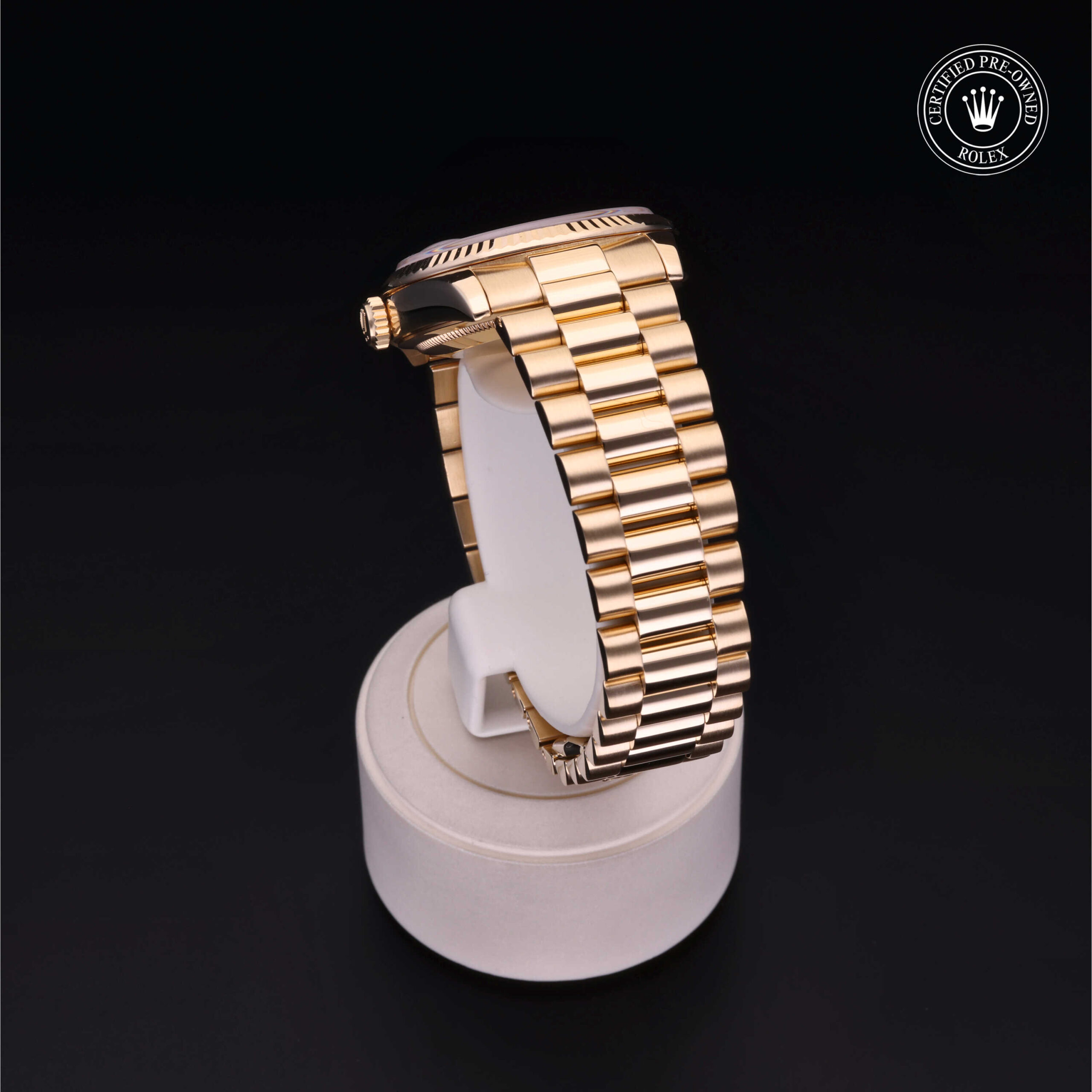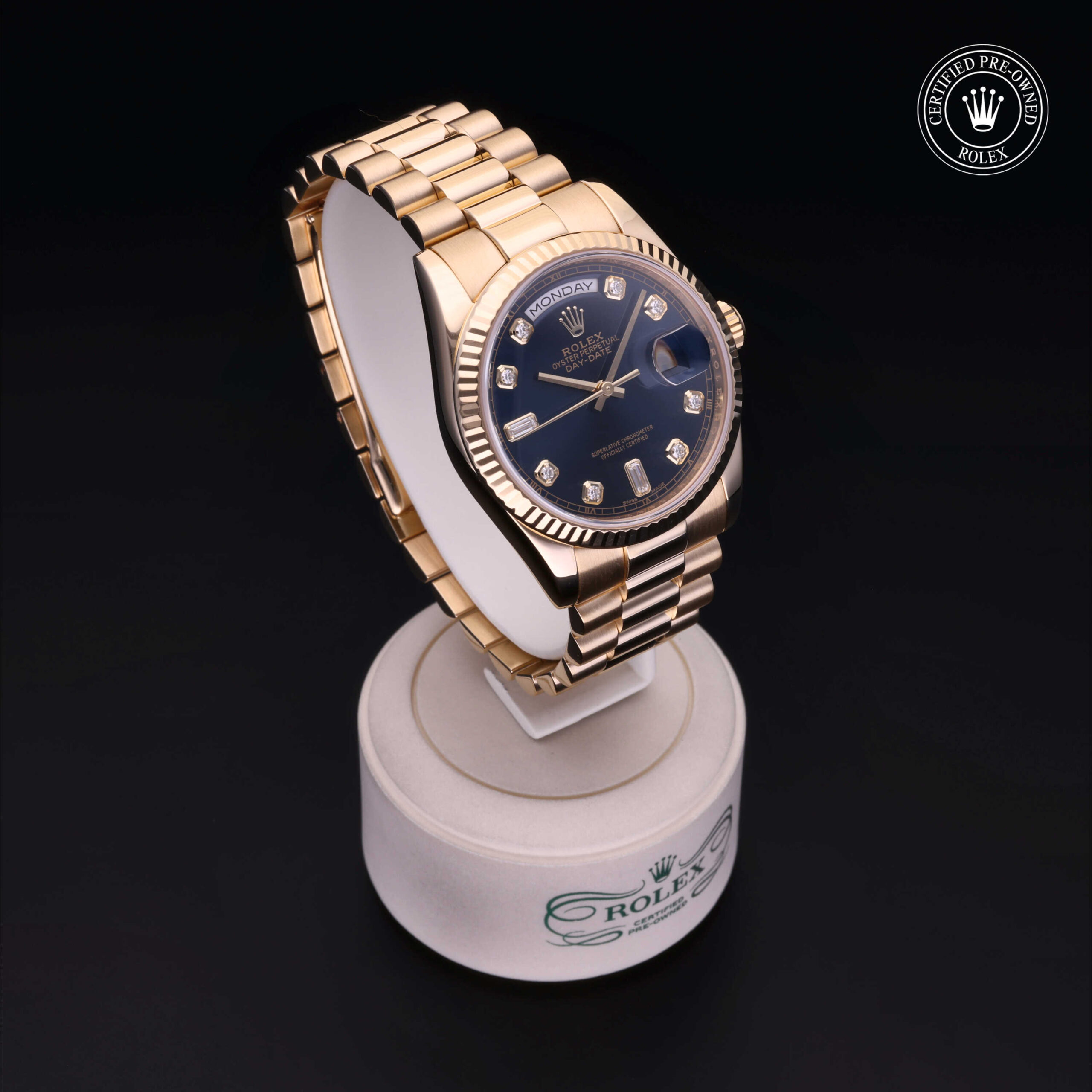 The Oyster Perpetual Day-Date, available only in 18 ct gold or 950 platinum, embodies the essence of Rolex prestige and excellence.