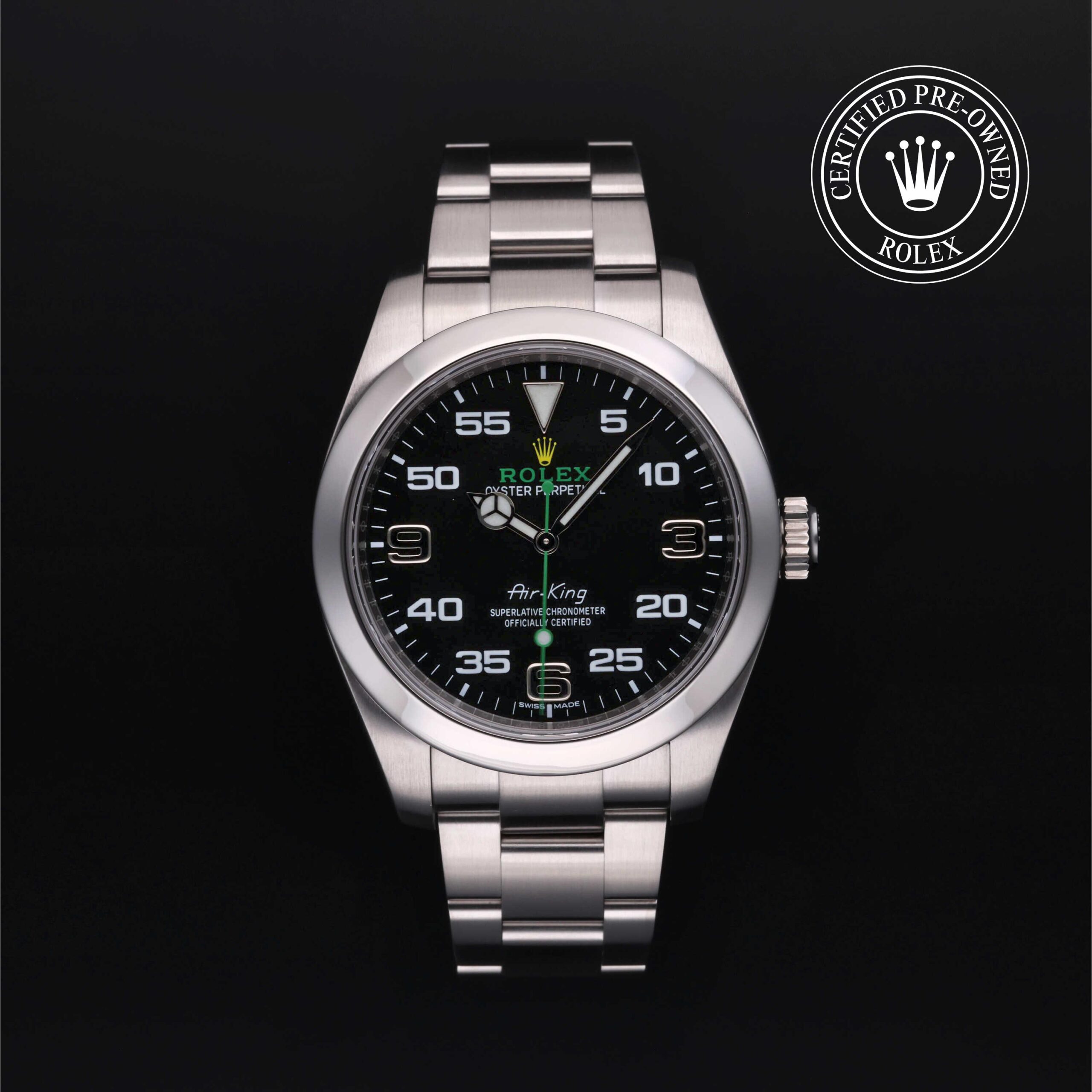 Its distinctive black dial combines large 3, 6 and 9 hour numerals with a prominent minutes scale for optimal navigational time readings. The name ‘Air-King’ has featured on the dial since the model’s launch in 1958. The special lettering makes the model immediately identifiable.