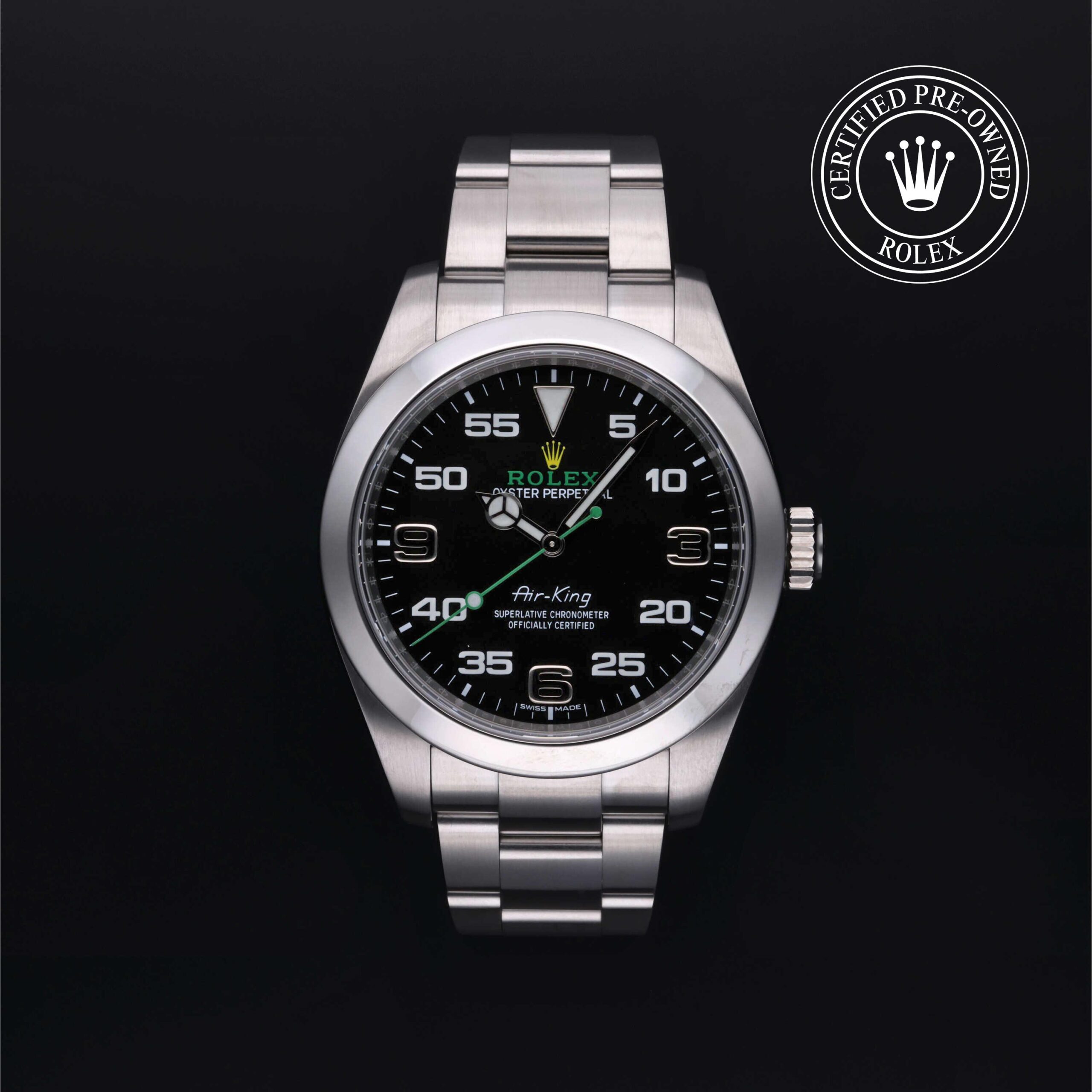 Its distinctive black dial combines large 3, 6 and 9 hour numerals with a prominent minutes scale for optimal navigational time readings. The name ‘Air-King’ has featured on the dial since the model’s launch in 1958. The special lettering makes the model immediately identifiable.
