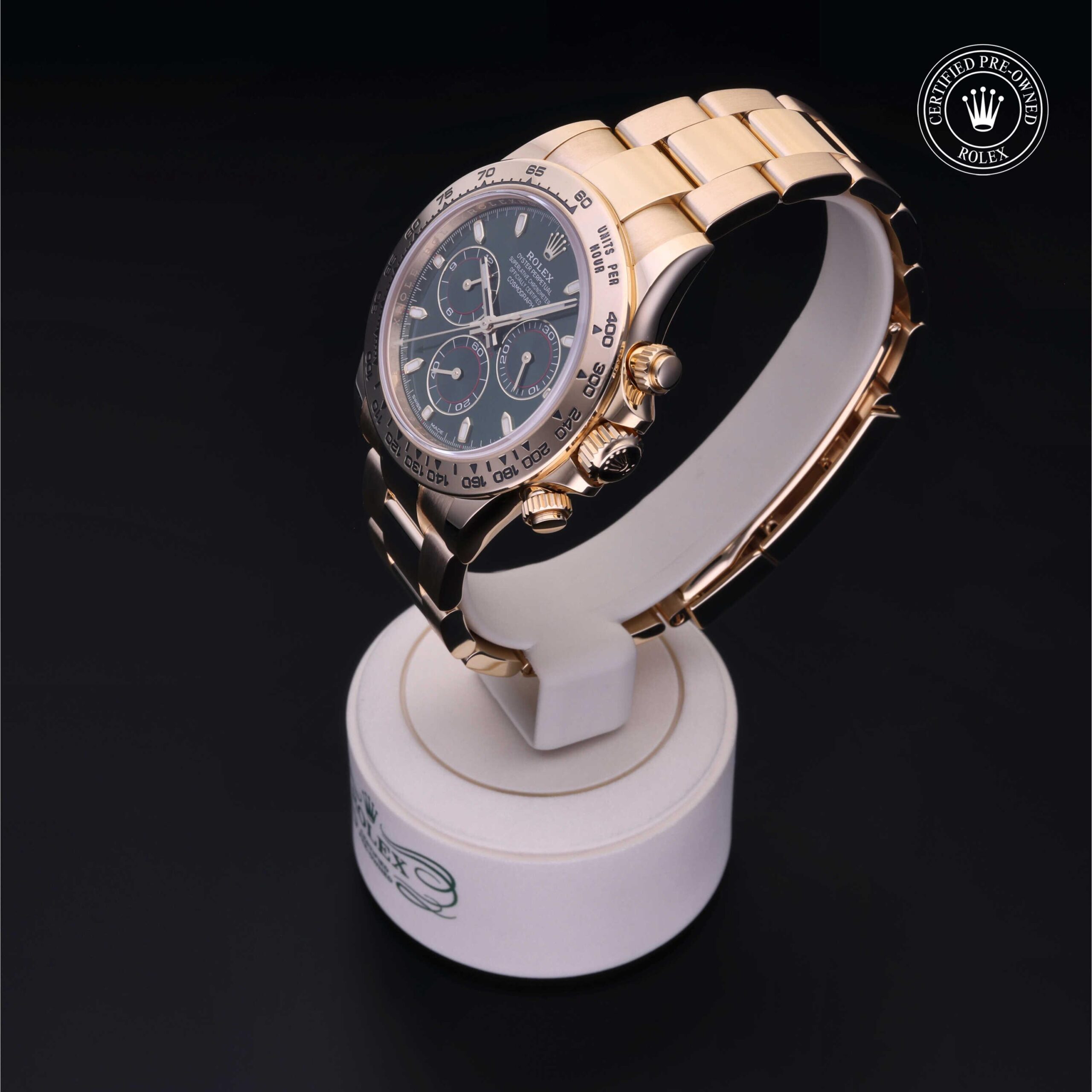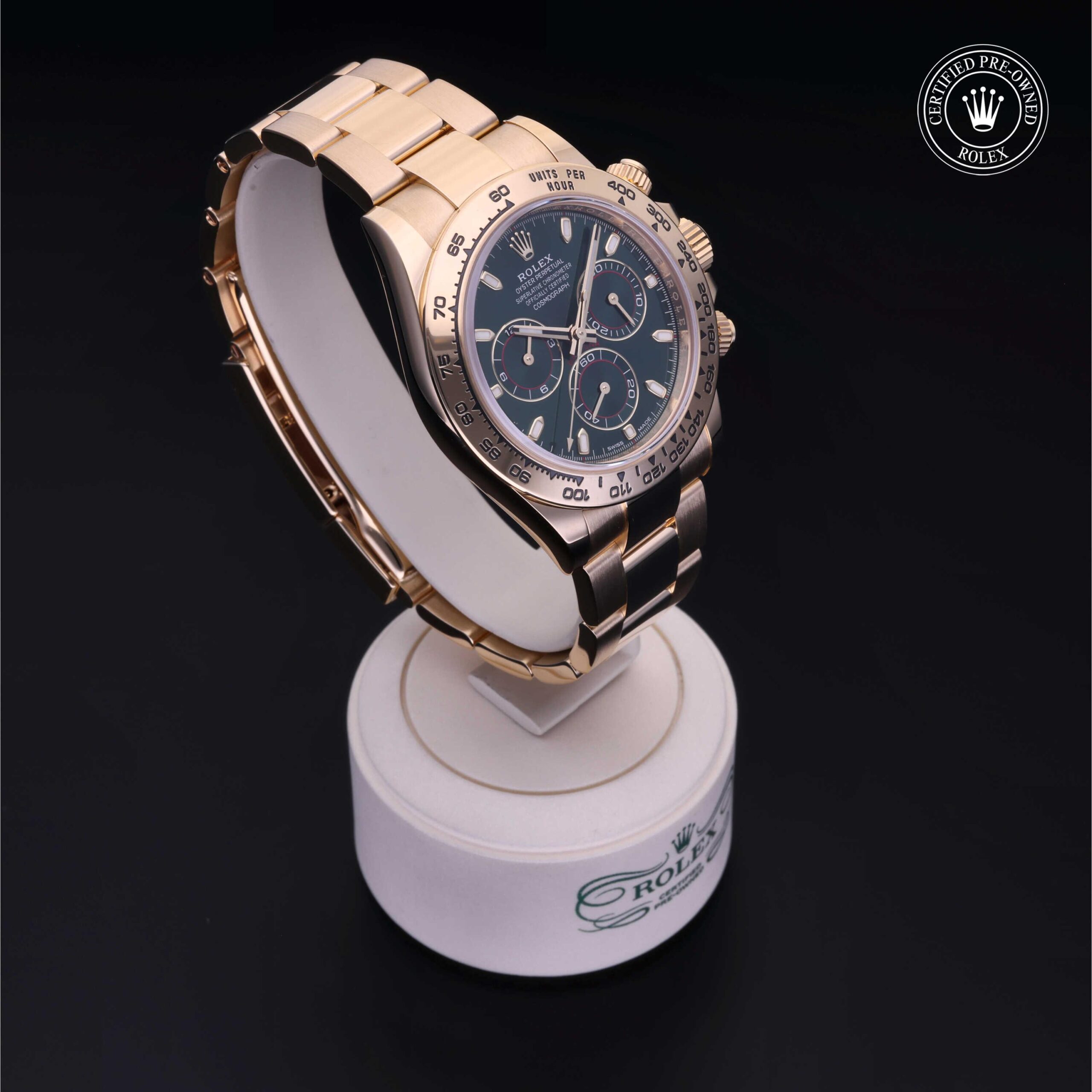 Today, this iconic chronograph is legendary for its reliability thanks to its high-performance mechanical movement entirely developed and manufactured by Rolex. Using the tachymetric scale on the bezel, the wearer can measure time intervals or determine average speeds.