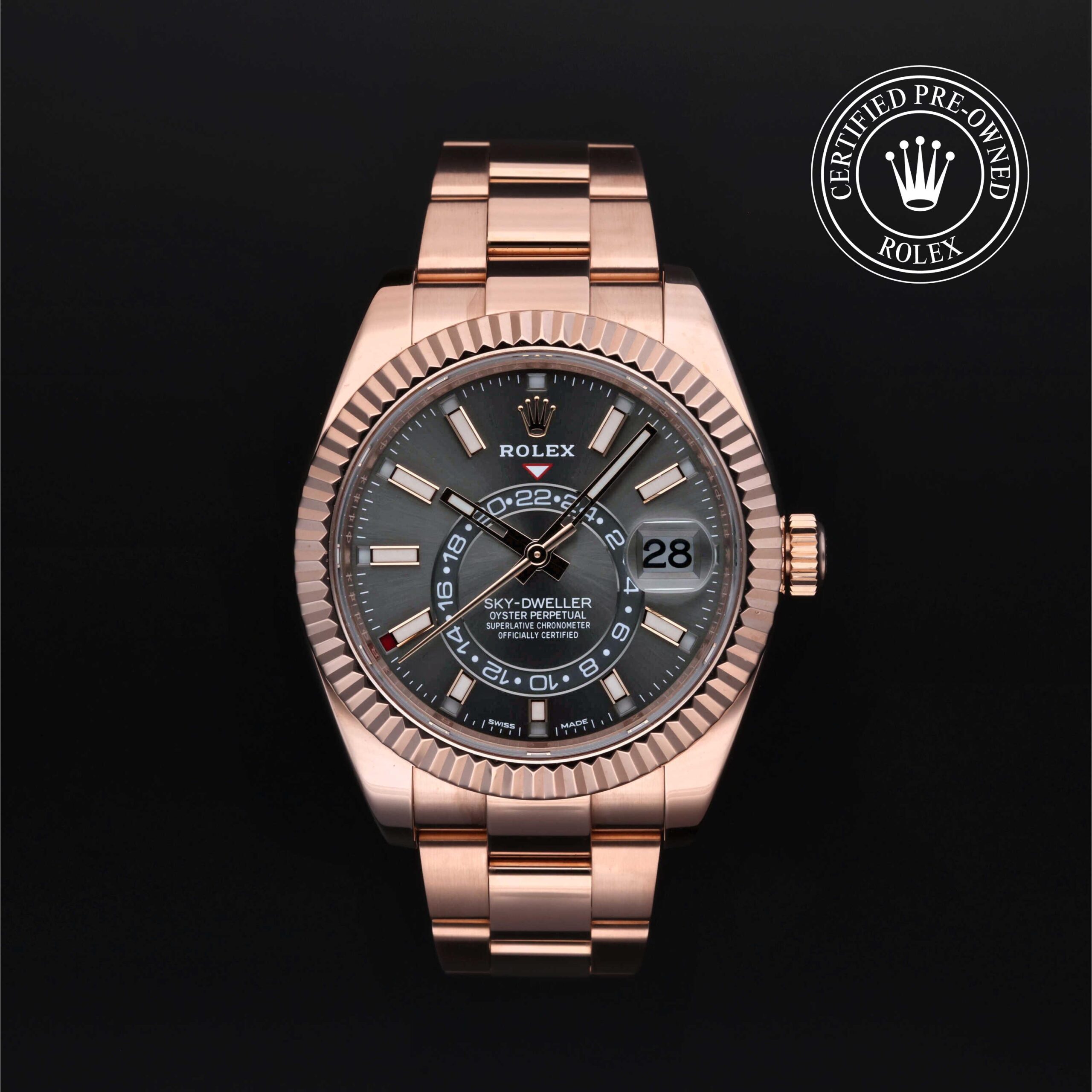 300-01544An elegant watch for world travellers, the Oyster Perpetual Sky-Dweller features a dual time zone and an annual calendar.