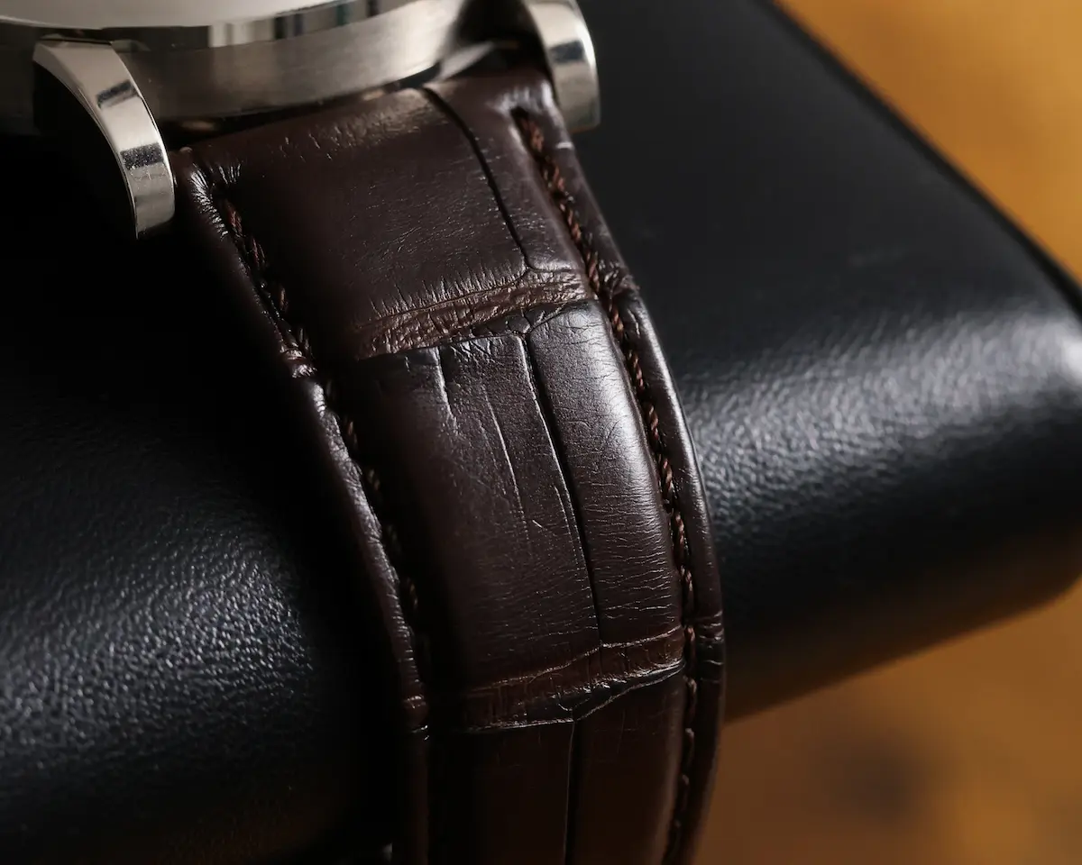 To sum up aesthetics in a phrase- this watch is simply remarkable. The offset main dial, which keeps time for the primary time zone, counterbalances the subdial, which tracks for alternate time zones, providing a vintage, unconventional appearance. The large panorama date window, smooth-polished case, and wielded lugs are signature brand features that enhance the design.