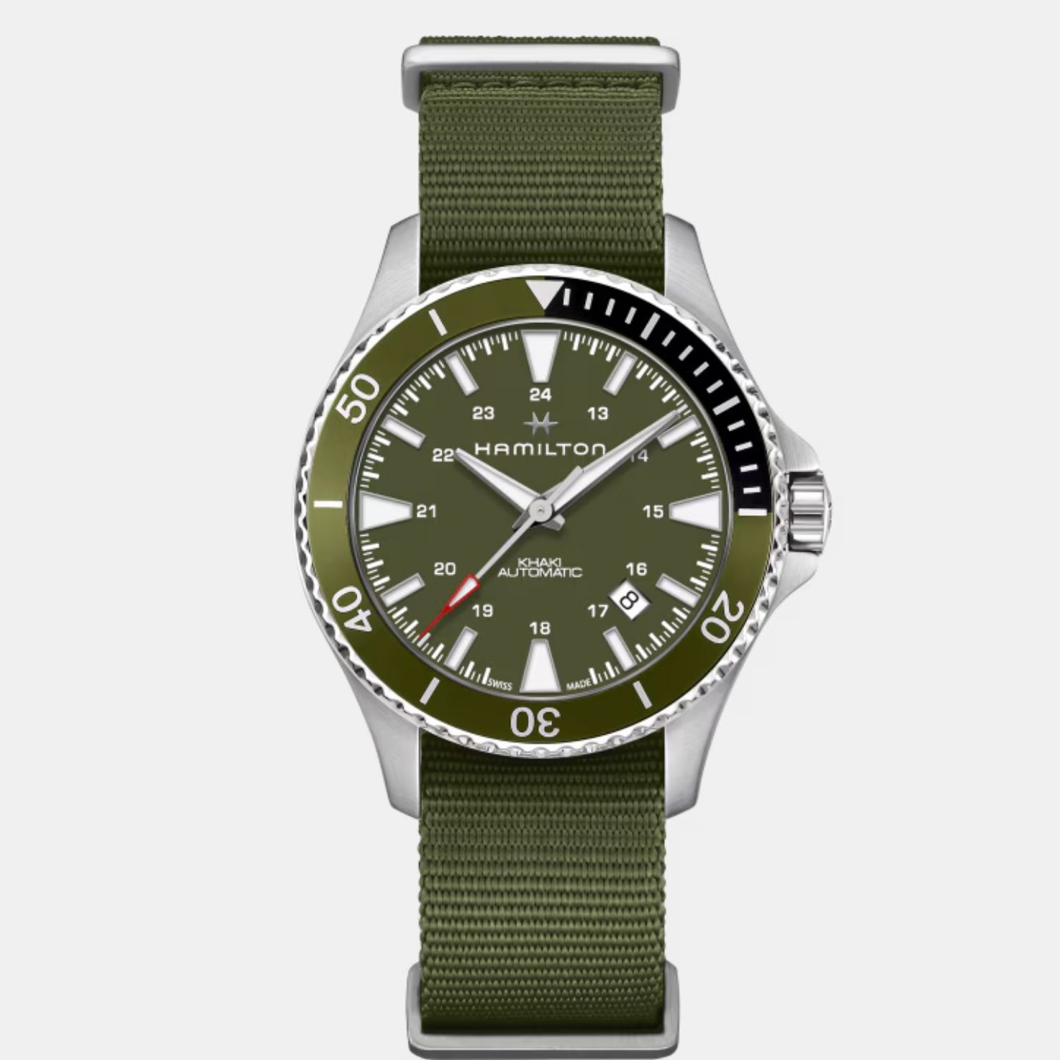 The Khaki Scuba Automatic 40mm is one of those watches that instantly feels fun to wear. The olive-green dial and matching strap give it a relaxed, outdoorsy look. We think this is a perfect watch to give to anyone who wants an easy, everyday watch. At 40mm, it hits a really comfortable size. The bezel is easy to grip, the dial is clear, and the splash of red on the seconds hand adds a tiny pop of color.