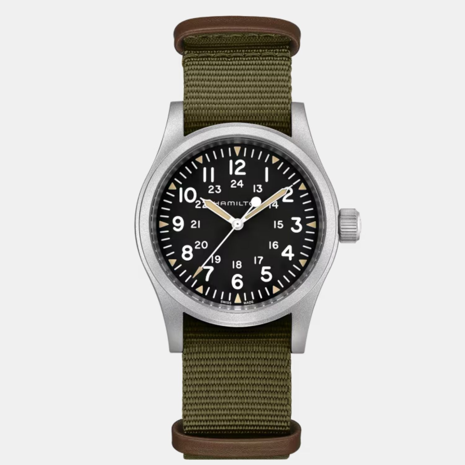 This 38mm version brings the design closer to its vintage field-watch roots. The black dial is simple in the best way, and the leather strap gives it a slightly dressed-up look that works for everyday outfits or nicer holiday events. Inside, you get Hamilton’s H-10 movement with an 80-hour power reserve.