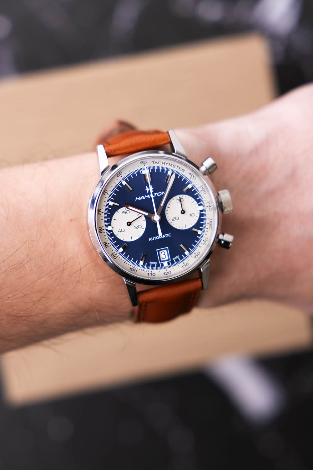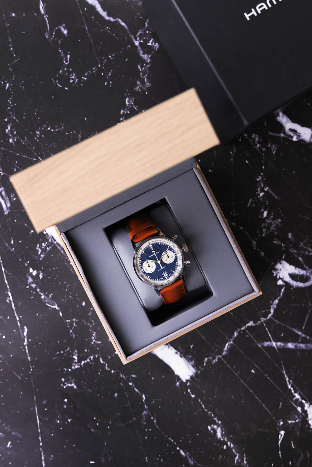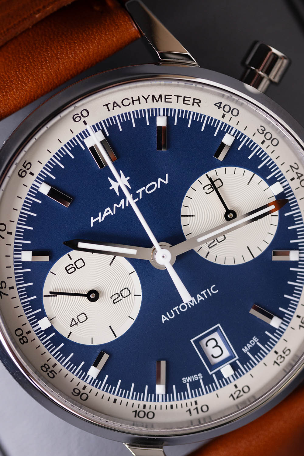 Available in two colorways - reversed panda dial in blue and panda black dial - the watch offers versatility. The white tachymeter, snailed pattern sub-dials, and polished steel indices with Super-LumiNova add to its readability and allure. The framed date window at 6 o'clock and the classic Hamilton logo complete the dial’s sophisticated look.