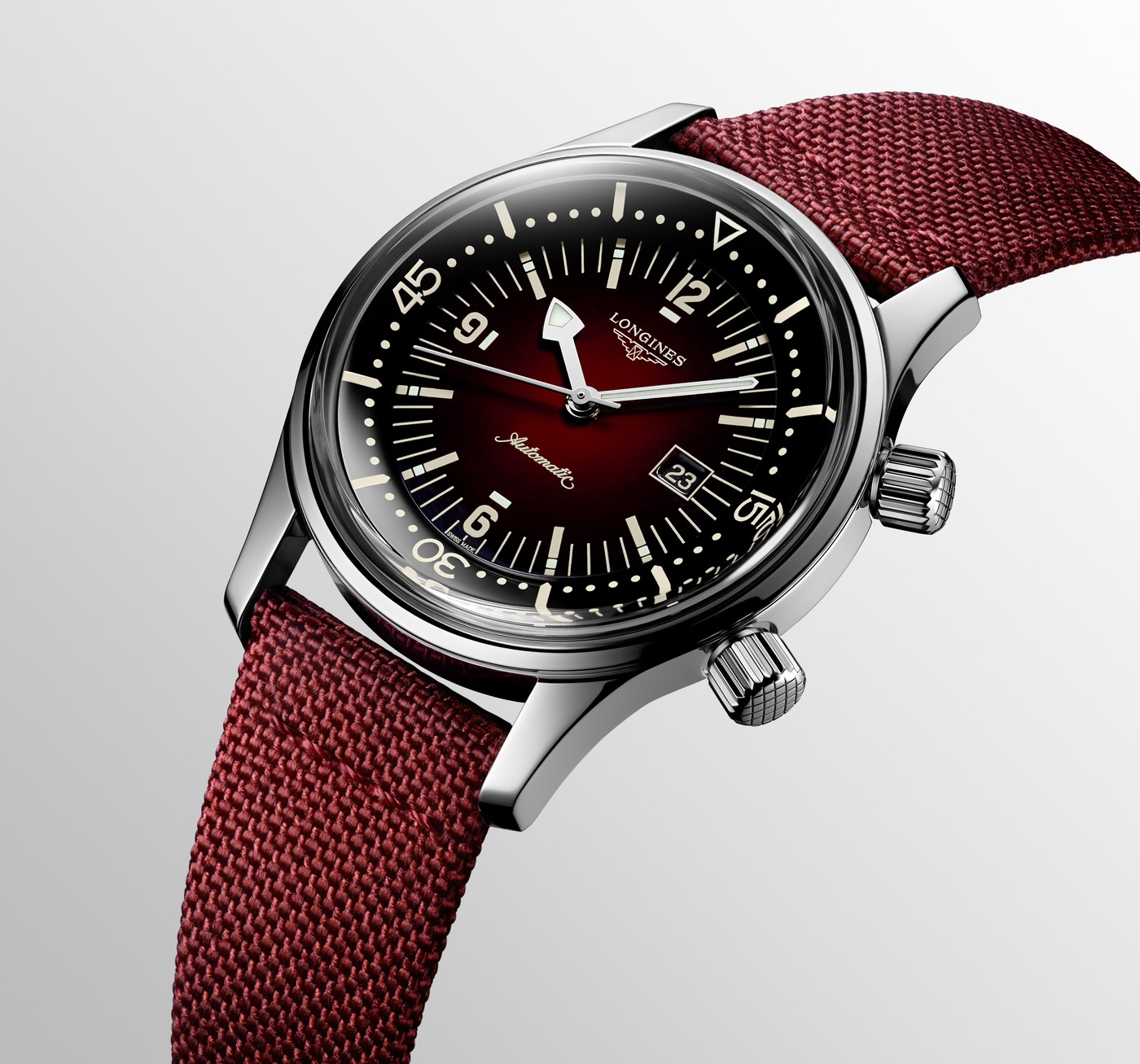 Launched in 2007 and designed in tribute to the vintage Super-Compressor from 1959, the vintage-inspired Legend Diver is a fantastic and varied Longines sports watch collection. For this year, Longines has expanded the Legend Diver lineup with new colorways, available in 42mm and 36mm sizes. The latest dial color options for the 42mm variants are sand beige and ash grey, while the 36mm models come in royal blue, vivid burgundy, and sand beige — some versions are even paired with straps in a matching tone for a sleek monochromatic style. Other signature details remain the same, from the box-shaped sapphire crystal and the duo of screw-down crowns on the case to the internal rotating diving bezel and mix of Arabic numeral and stick indexes.