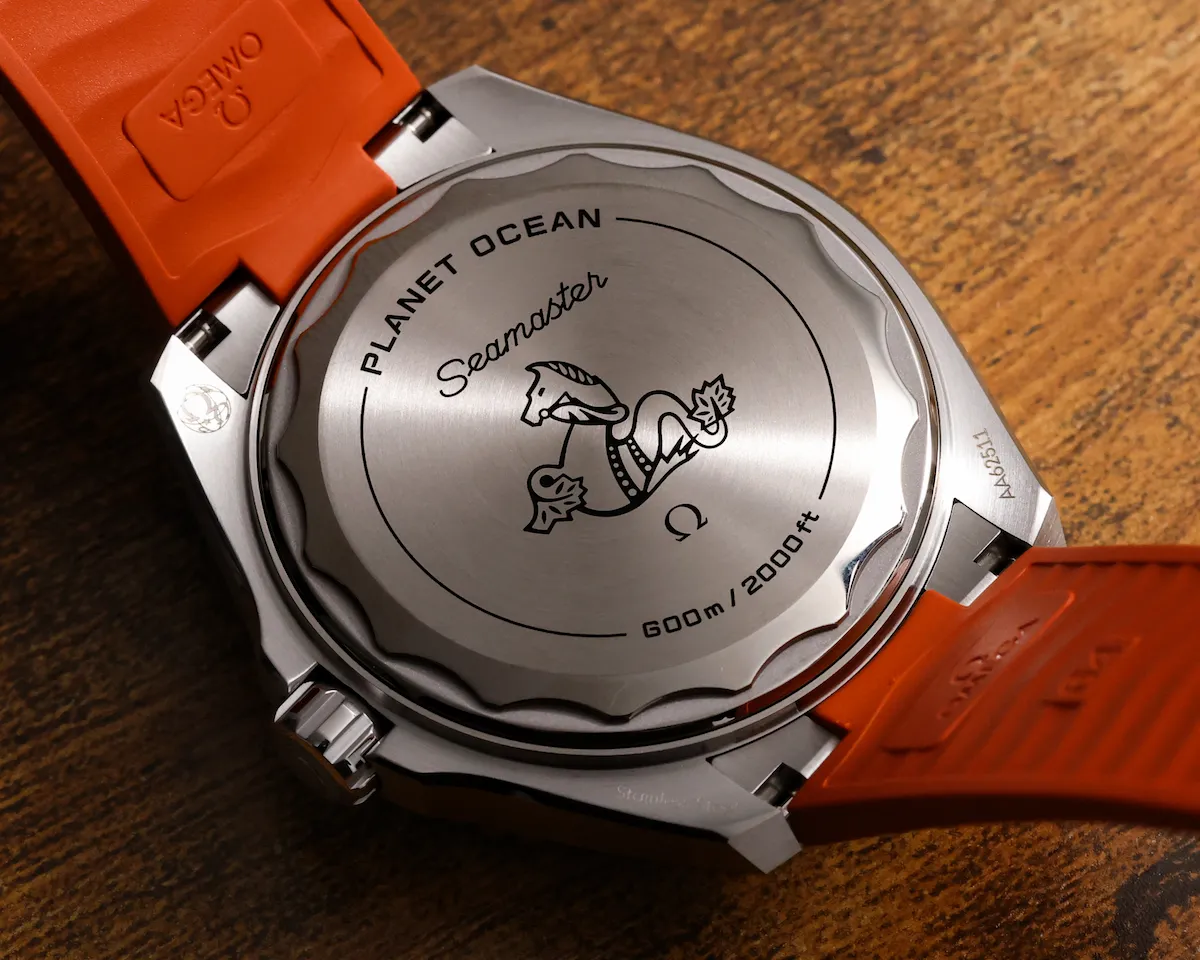 Flipping the watch over, you find it features a solid caseback made of titanium rather than steel, making it lighter and more corrosion-resistant. It features the Planet Ocean seahorse signature logo, a nod to the watch brand’s vintage roots.