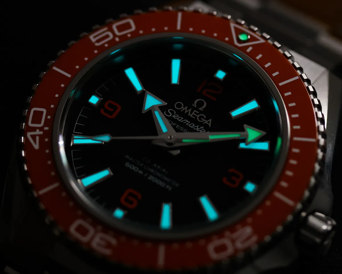 - Orange: Orange is a common color choice in Omega watches, but the orange in the new watches is brighter and bolder. The new model features an orange ceramic bezel, matte orange Arabic numerals against a matte black dial, and a white hybrid ceramic diving scale. My personal favorite features a matching orange rubber strap, which just pops.