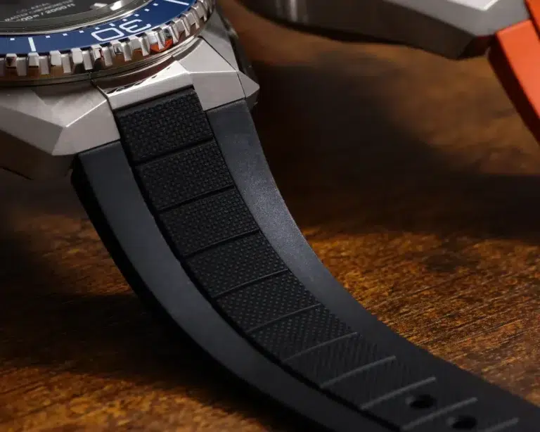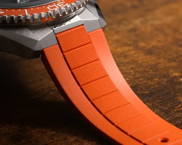 A fold-over clasp lets you put on and take off the watch in one swift movement. The vulcanized rubber and materials are UV- and dust-resistant, and chemically resistant, optimized for wear in harsh conditions.