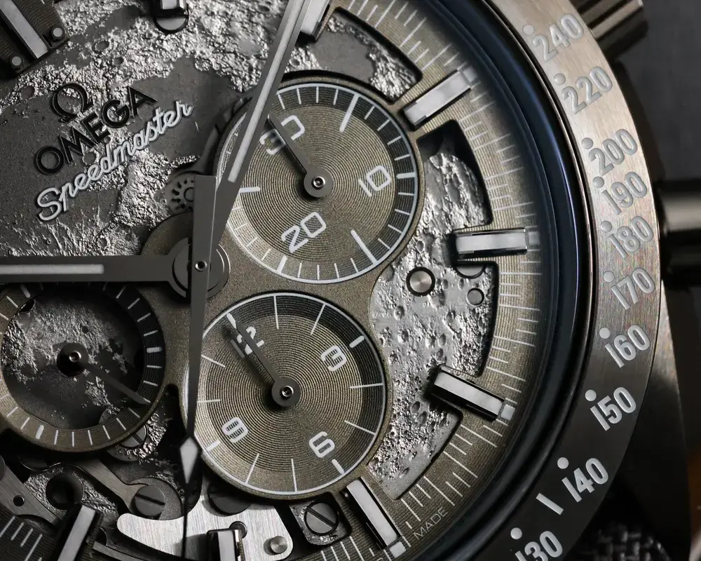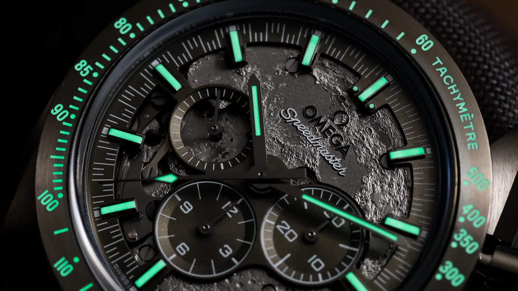 White Super-LumiNova is inside the greyed Moonwatch-style hands and beveled indexes. It emits a green glow, which makes the overall look more celestial.