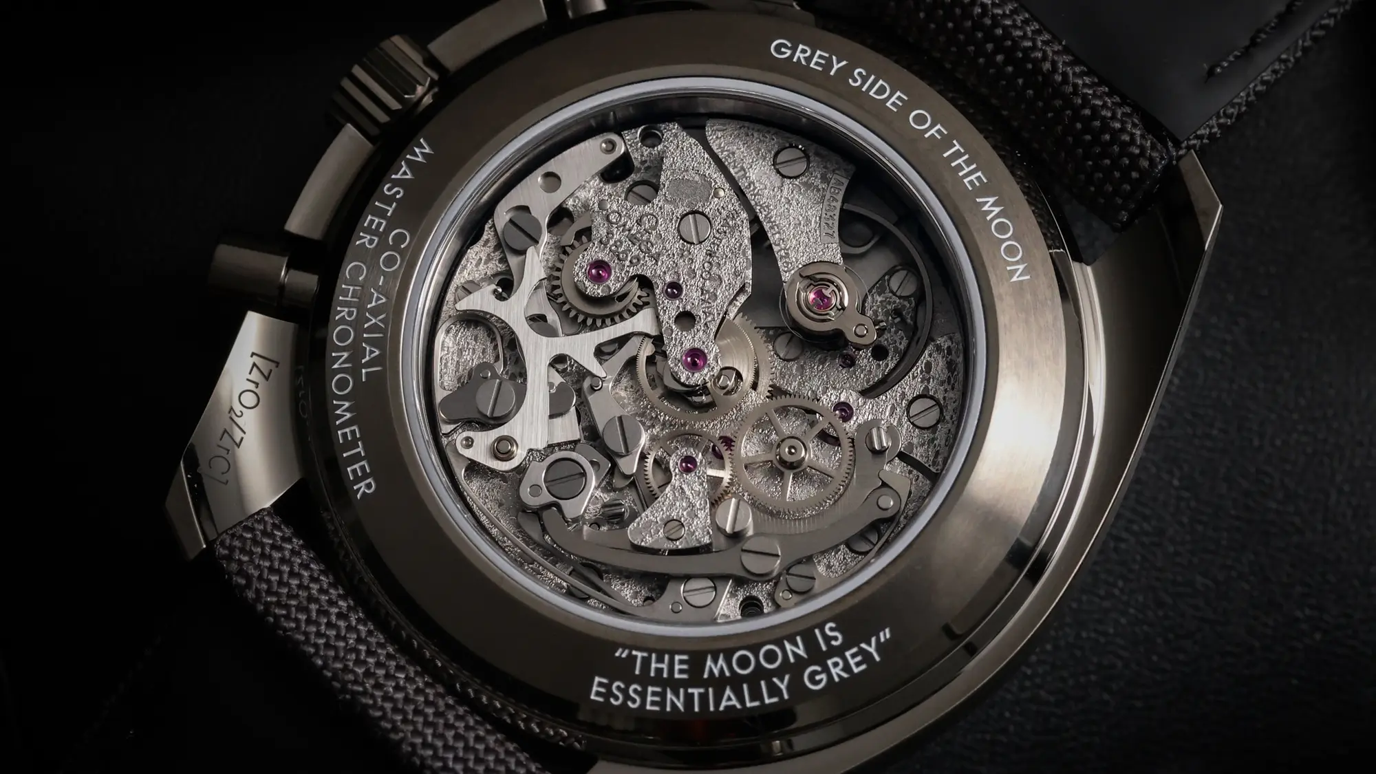 The Omega Co-Axial Master Chronometer Caliber 3869 is powering the Speedmaster Dark Side of the Moon movement. This caliber is certified by METAS as a Master Chronometer and has a majestic decoration. Its movement is visible through the transparent caseback. It clearly showcases the powerful and intricate engraving of the machinery. This makes the spectator wonder about the technical refinement of the Caliber 3869.
