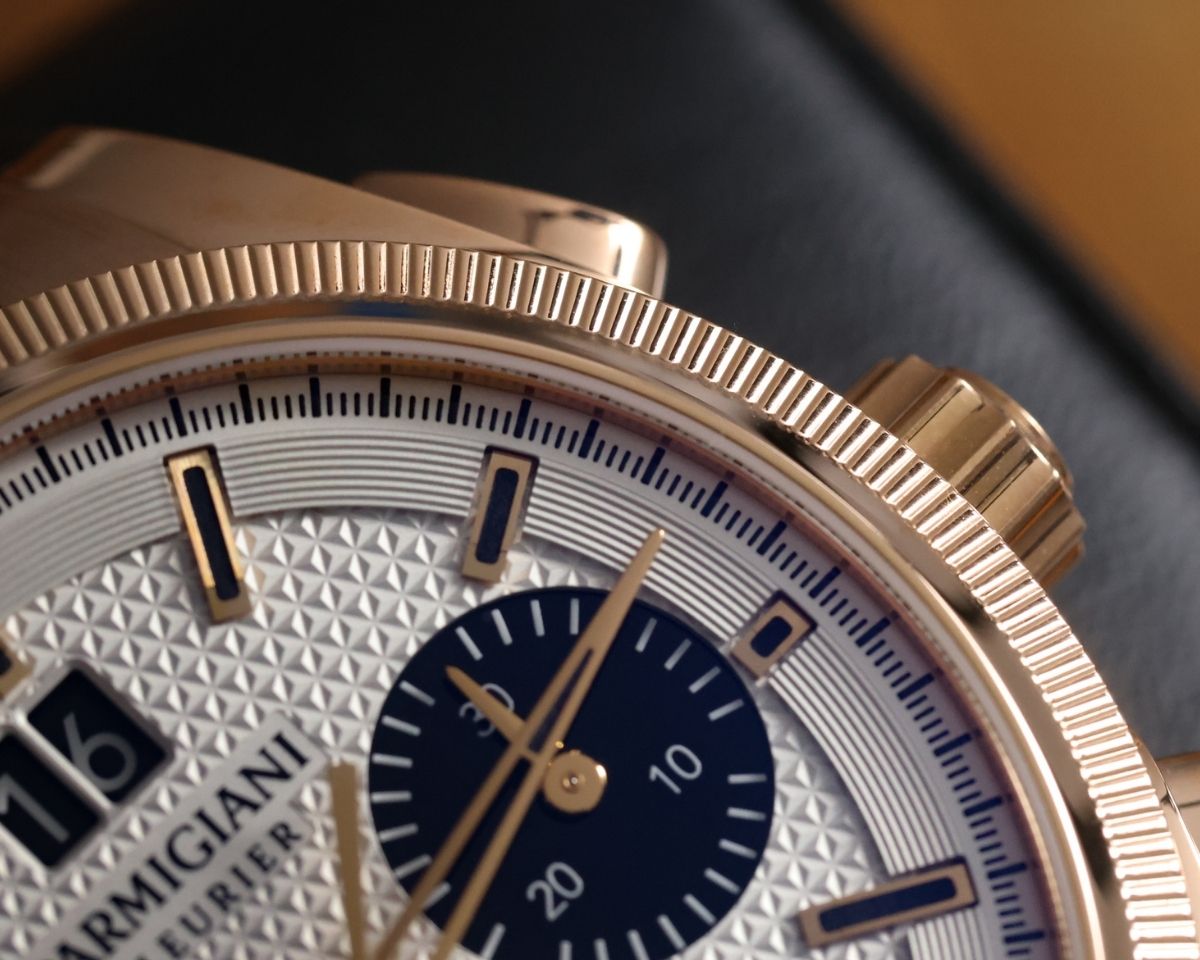 Parmigiani uses traditional guilloché techniques and modern machinery. The “Clou Triangulaire” pattern has beautiful depth and texture.