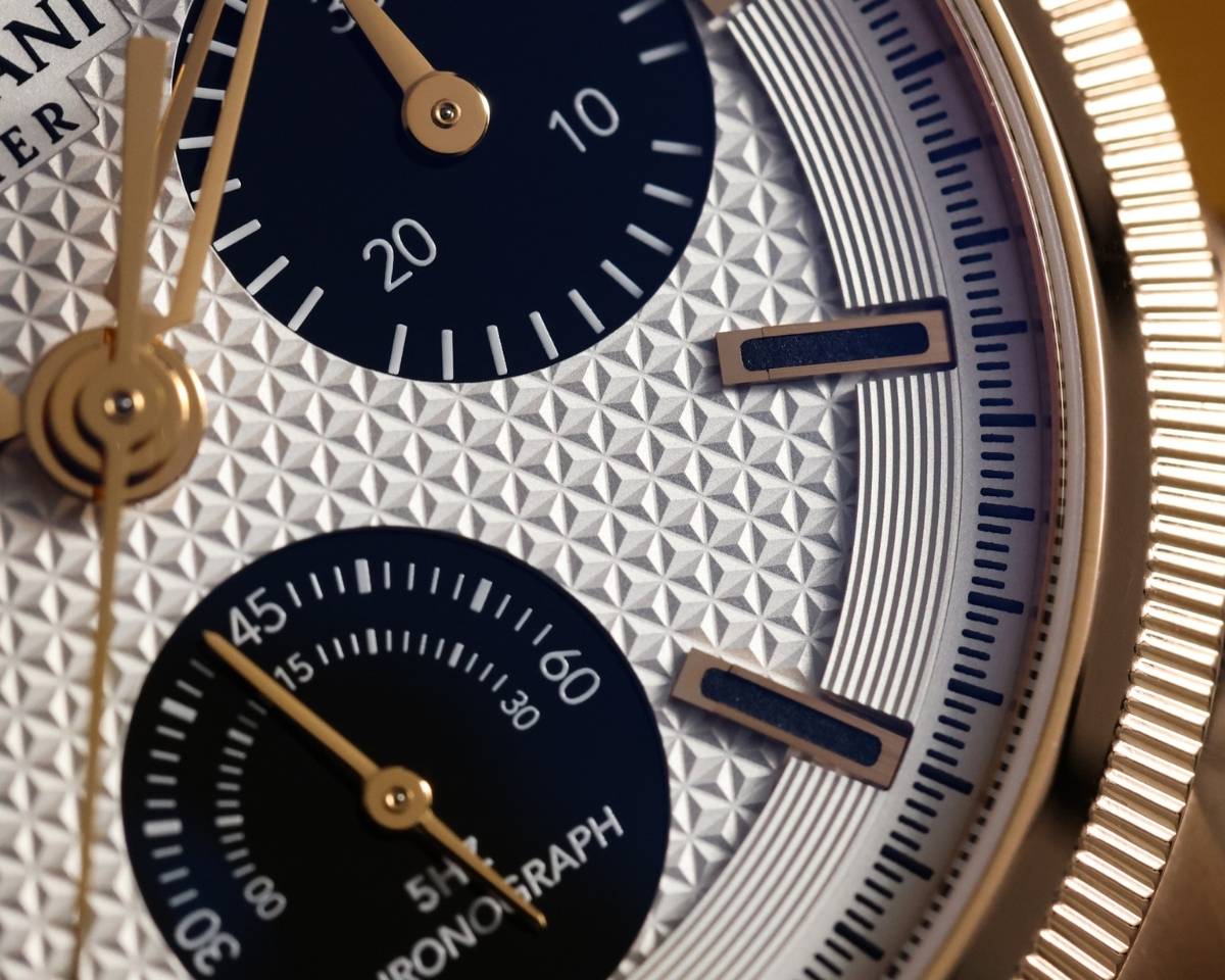 The dial is where Parmigiani’s design language really shines. The silver base has a “Clou Triangulaire” guilloché pattern that creates depth and catches the light effortlessly. Against that backdrop, the black chronograph subdials stand out cleanly without breaking the design’s balance.