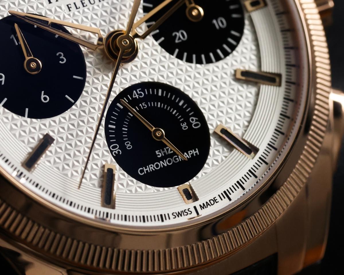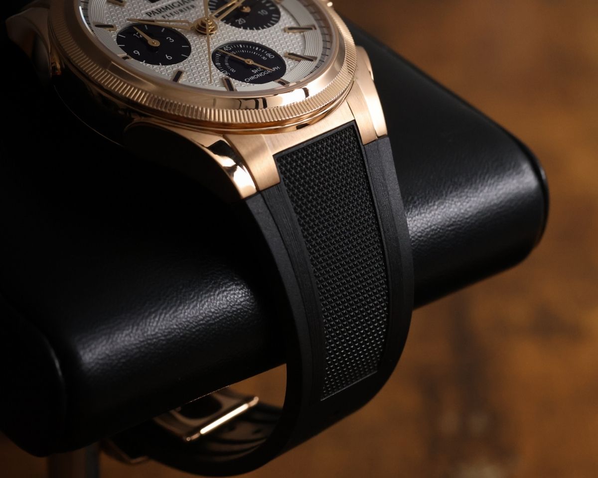This version combines a rose-gold case, a silver guilloché dial with black chronograph sub-dials, and an in-house high-beat movement. It also has a rubber strap rather than a bracelet.