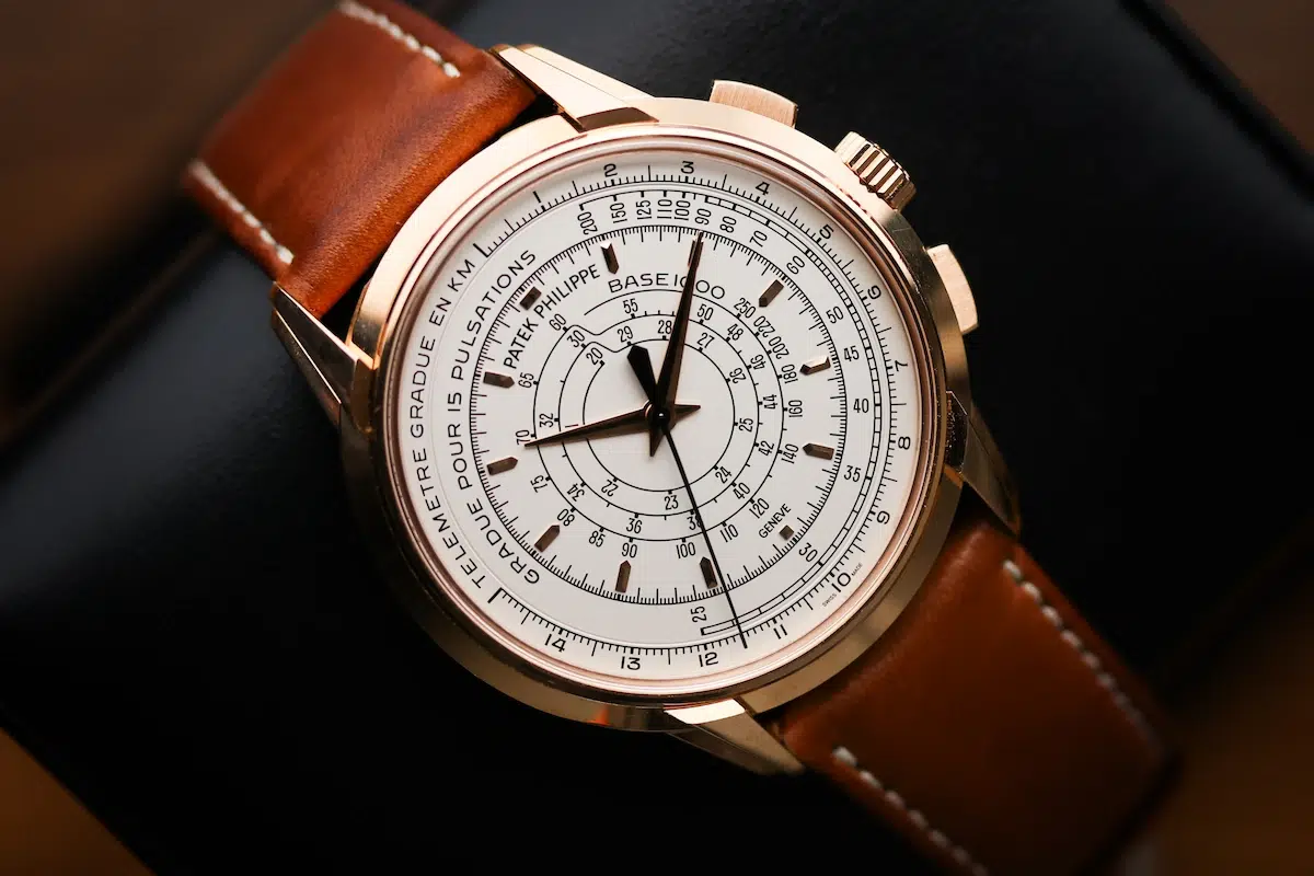 The 18K rose gold case, opaline, cream multi-scale dial, and leather strap make the 5957R-001 more of a dress watch. However, its technical character and rugged lines provide sports-watch functionality.