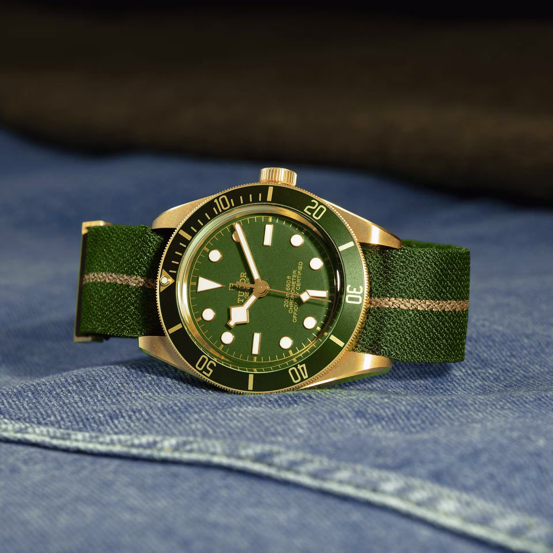 The Tudor Black Bay 58 18K is another style to look out for. It features a bold, olive green face and bezel in a gold setting with gold accents on the dial and pearlescent indices. A three-link gold bracelet complements the face, and leather straps are also available.